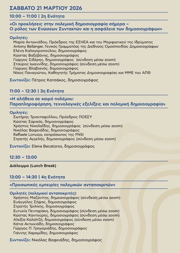 Παράλληλα, δημοσιογράφοι που βρίσκονται σε ενεργές εστίες συγκρούσεων, όπως στο Ισραήλ, τον Λίβανο και στα σύνορα με την Τουρκία, θα συμμετάσχουν διαδικτυακά, μεταφέροντας τις εμπειρίες τους και καταθέτοντας προτάσεις για το μέλλον της πολεμικής δημοσιογραφίας.
