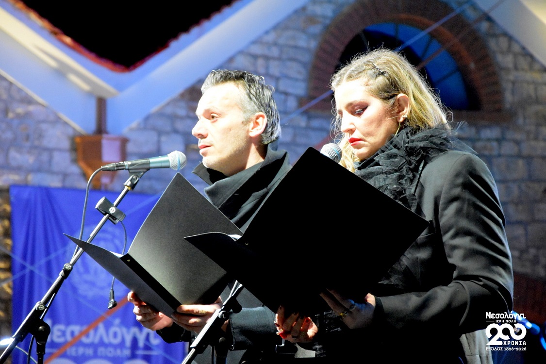 Η βραδιά απέκτησε ιδιαίτερο βάθος μέσα από την υποβλητική αφήγηση των εξαιρετικών ηθοποιών Μαρίας Κίτσου και Γιώργου Νανούρη, οι οποίοι ζωντάνεψαν τα κείμενα της Μαρίνας Κασσαβέτη. Το οπτικό αποτέλεσμα ολοκληρώθηκε με το εντυπωσιακό video-animation του Μεσολογγίτη Αγησίλαου Ρόμπολα, προσφέροντας μια πολυαισθητηριακή εμπειρία αντάξια της ιστορικής μνήμης της πόλης μας.