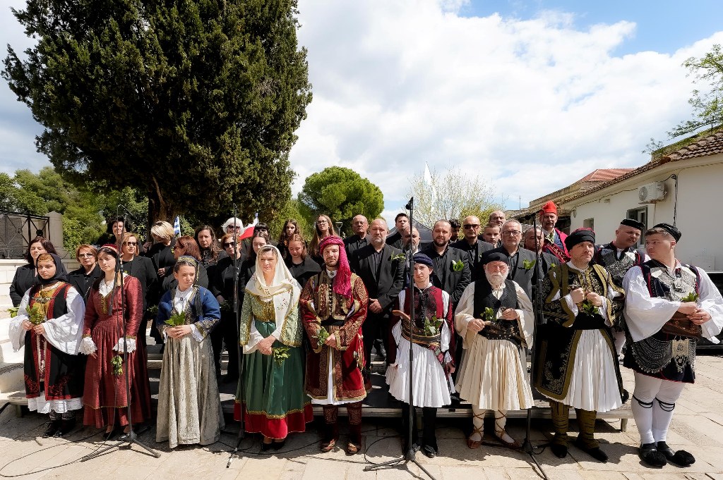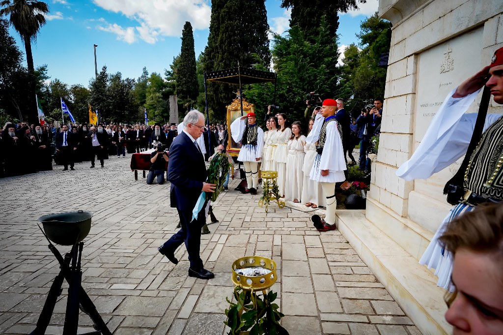 Ακολούθησαν η κατάθεση στεφάνου από τον Εξοχώτατο Πρόεδρο της Ελληνικής Δημοκρατίας κ. Κωνσταντίνο Τασούλα και η εκφώνηση του πανηγυρικού της ημέρας από τον Εξοχώτατο Πρωθυπουργό κ. Κυριάκο Μητσοτάκη, ενώ η υψίφωνος κα Βίβιαν Ντάγκλας απέδωσε το μοιρολόι «Να ζει το Μεσολόγγι».