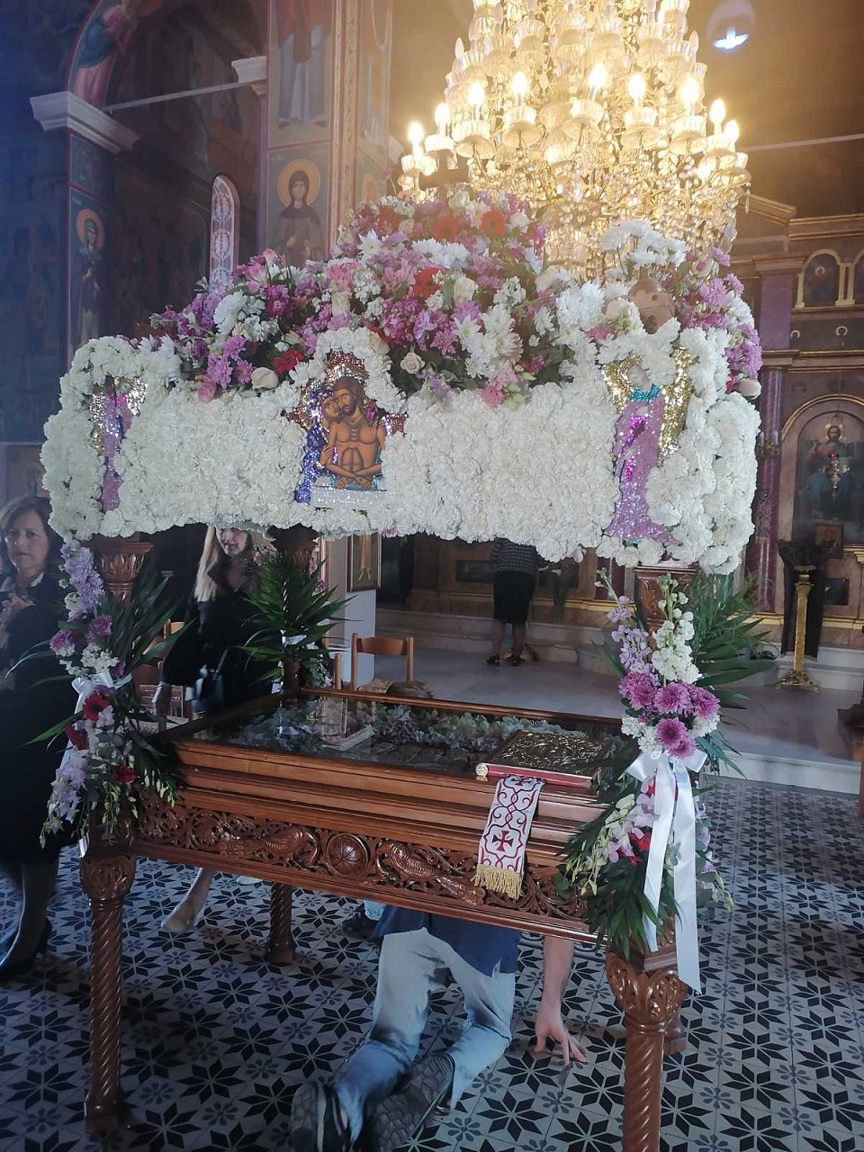 Στον Ιερό Ναό Αγίου Νικολάου Καλυβίων τηρήθηκε και φέτος το έθιμο του στολισμού του Επιταφίου από τις γυναίκες της ενορίας και από ιδιωτικό Ανθοπωλείο του Αγρινίου, που είχε την επιμέλεια και την φροντίδα της διακόσμησης.