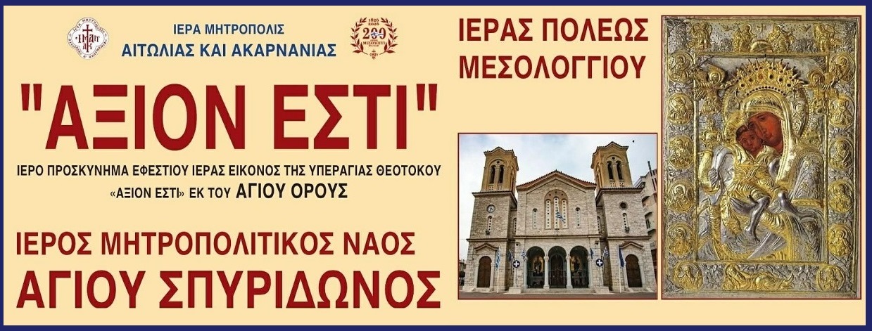 Με αισθήματα βαθείας συγκινήσεως και πνευματικής αγαλλιάσεως η Ιερά Μητρόπολις Αιτωλίας και Ακαρνανίας αναγγέλλει προς τον ευσεβή λαό την έλευση της Ιεράς και Θαυματουργού Εικόνος της Υπεραγίας Θεοτόκου «Άξιον Εστί» εκ του πανσέπτου Ιερού Ναού του Πρωτάτου του Αγίου Όρους, στην Ιερά Πόλη του Μεσολογγίου.