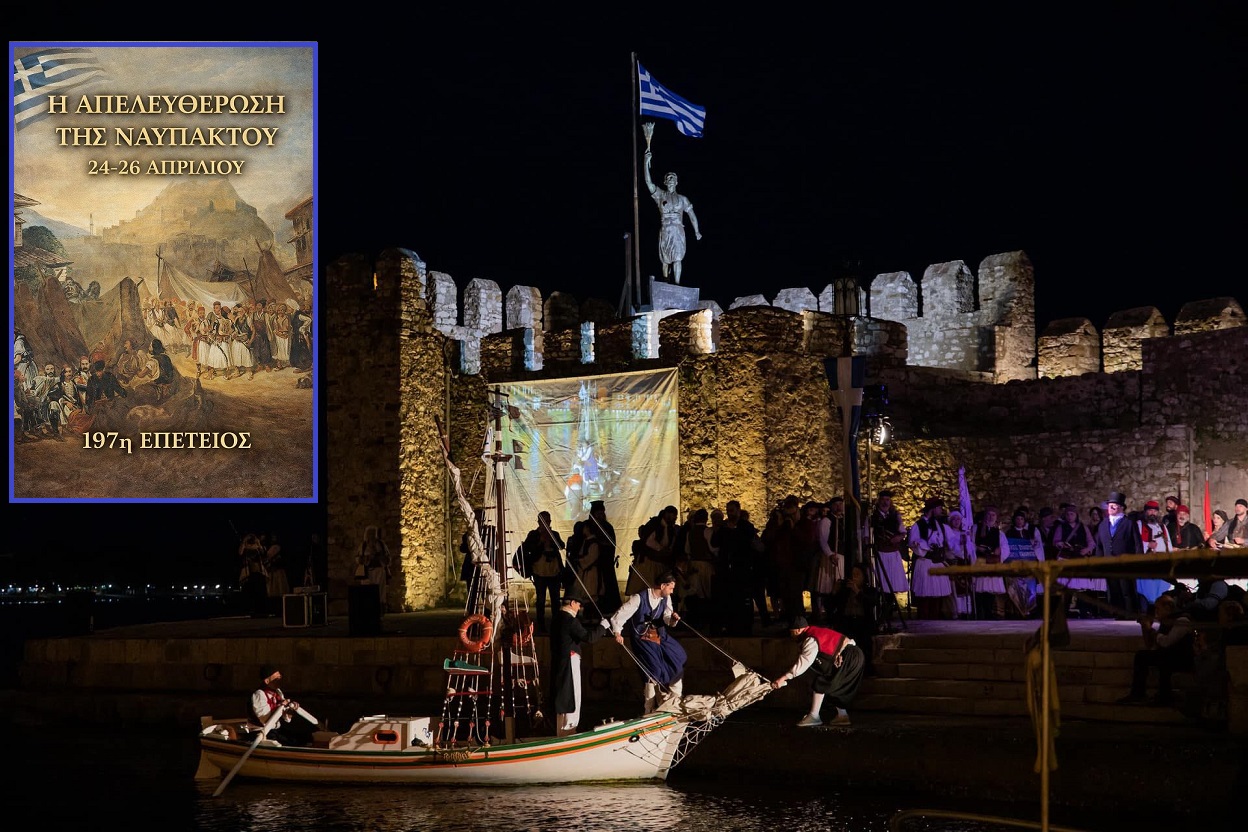 Ο Δήμος Ναυπακτίας εορτάζει με λαμπρότητα από τις 24 έως 26 Απριλίου 2026 την 197η Επέτειο της Απελευθέρωσης της Ναυπάκτου, με σειρά εκδηλώσεων που διοργανώνονται με την υποστήριξη της Ιεράς Μητρόπολης Ναυπάκτου και Αγίου Βλασίου, της Περιφέρειας Δυτικής Ελλάδος, της Εφορείας Αρχαιοτήτων Αιτωλοακαρνανίας και Λευκάδος, του Ιδρύματος Δημητρίου και Αίγλης Μπότσαρη και του Συλλόγου Αναβίωσης Απογόνων Σουλιωτών Ναυπακτίας «Έπαχτος».