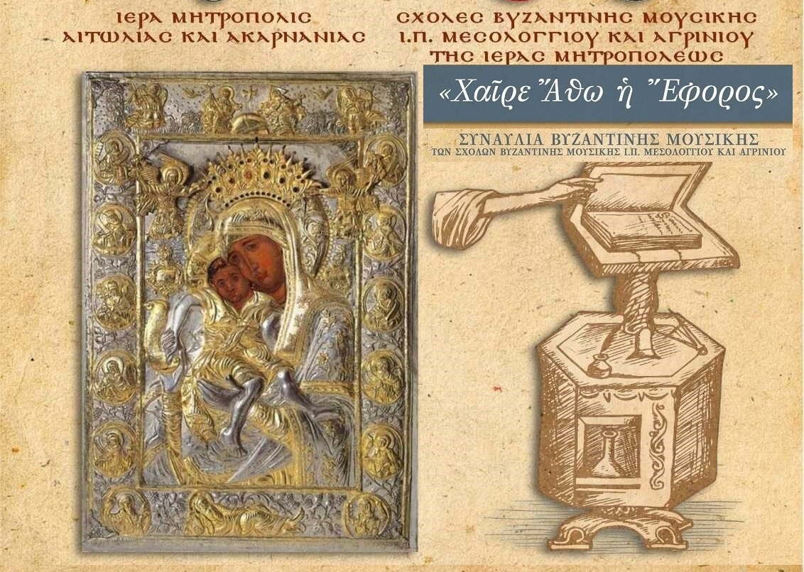 Η Ιερά Μητρόπολη Αιτωλίας και Ακαρνανίας προσκαλεί το ευσεβές πλήρωμα της τοπικής μας Εκκλησίας στη Συναυλία των Σχολών Βυζαντινής Μουσικής, προκειμένου να τιμήσει την Ιερά Κοινότητα του Αγίου Όρους και να λάβει την πατρική ευχή του Αγίου Πρωτεπιστάτου και των Αγιορειτών Πατέρων.