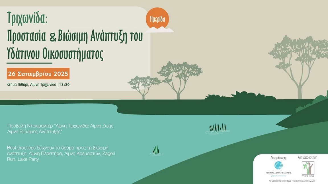 Εκδήλωση με θέμα: «Τριχωνίδα: Προστασία & Βιώσιμη Ανάπτυξη του Υδάτινου Οικοσυστήματος», διοργανώνει η Περιφέρεια Δυτικής Ελλάδας, την Παρασκευή 26 Σεπτεμβρίου 2025 και ώρα 18.30 στη λίμνη Τριχωνίδα (Κτήμα Πιθάρι), στο πλαίσιο της πρωτοβουλίας "Οικονομική Υποστήριξη Εξωστρεφών Δράσεων 2025" του Πράσινου Ταμείου.