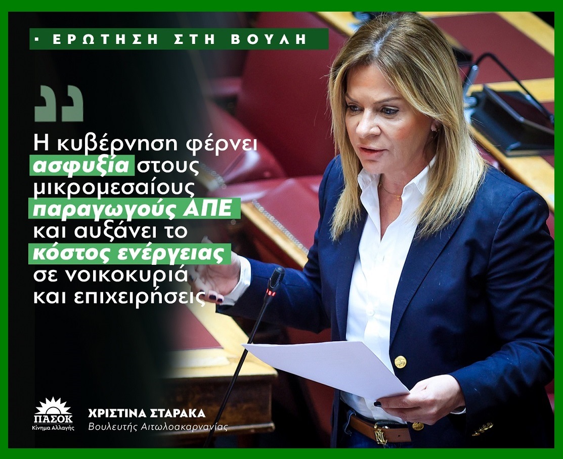 Ερώτηση προς τον Υπουργό Περιβάλλοντος και Ενέργειας, κατέθεσε η βουλευτής Αιτωλοακαρνανίας του ΠΑΣΟΚ – Κινήματος Αλλαγής, Χριστίνα Σταρακά, με τη συνυπογραφή του βουλευτή Ηρακλείου και Κοινοβουλευτικού Υπεύθυνου του Τομέα Ενέργειας, Φραγκίσκου Παρασύρη.