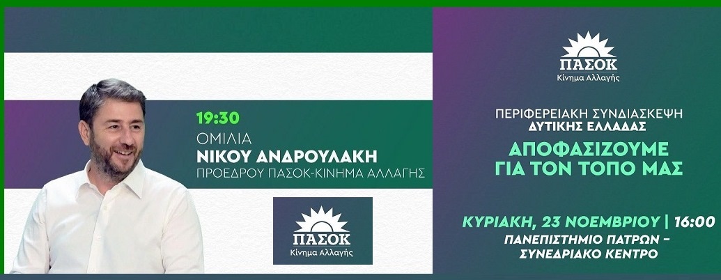 Την Κυριακή 23 Νοεμβρίου 2025, θα λάβει χώρα η Περιφερειακή Συνδιάσκεψη Δυτικής Ελλάδας, στο Συνεδριακό Κέντρο του Πανεπιστημίου Πατρών, η οποία θα ξεκινήσει στις 16.00 μ.μ. και θα λήξει με την ομιλία του Προέδρου του ΠΑΣΟΚ - Κινήματος Αλλαγής, Νίκου Ανδρουλάκη, στις 19.30 μ.μ.