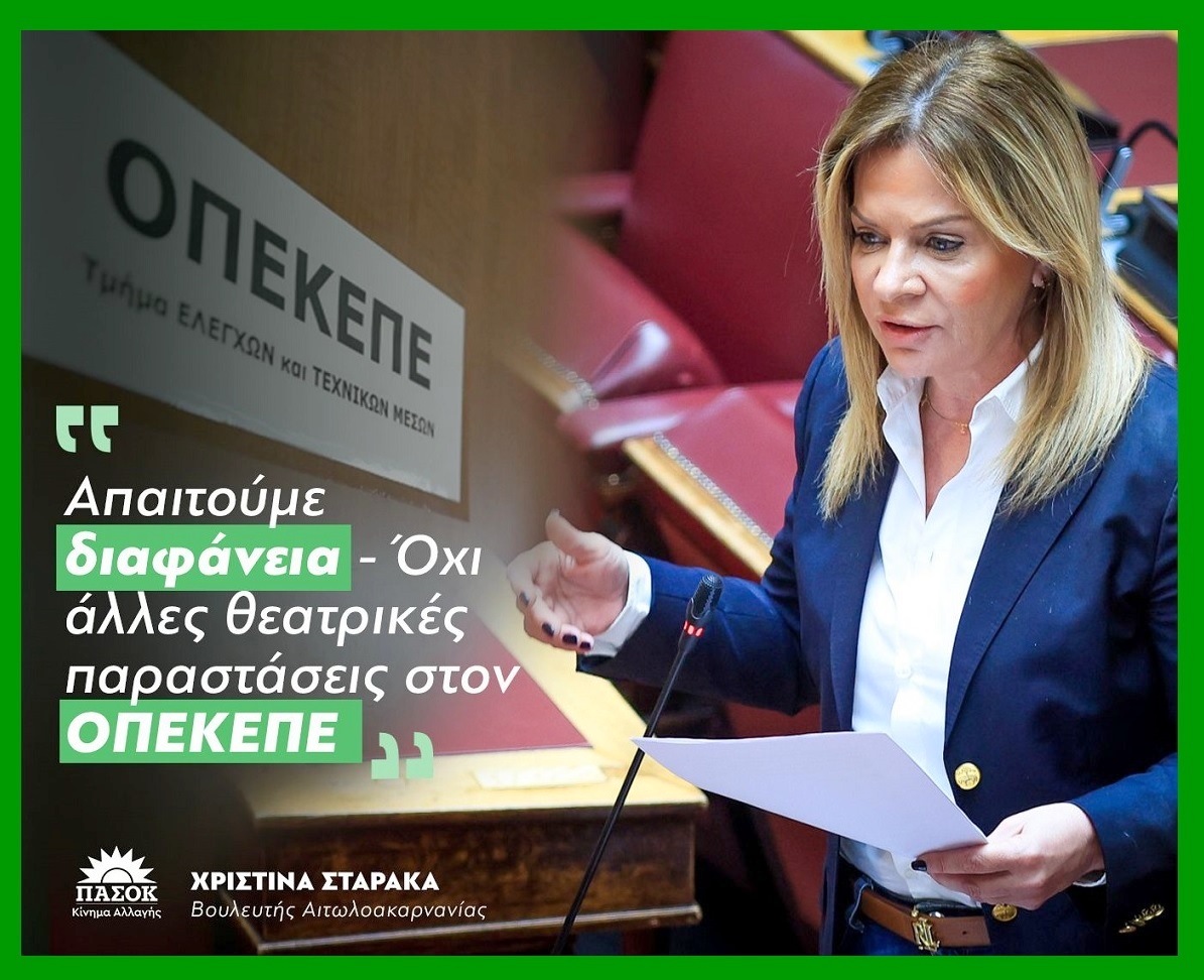 Σύμφωνα με δελτίο τύπου, με ιδιαίτερα αυστηρό τόνο τοποθετήθηκε η κα Χριστίνα Σταρακά, βουλευτής του ΠΑΣΟΚ - Κινήματος Αλλαγής, με αφορμή όσα συμβαίνουν τις τελευταίες ημέρες στον ΟΠΕΚΕΠΕ, που έχουν προκαλέσει έντονη ανησυχία στον αγροτικό κόσμο της Αιτωλοακαρνανίας.