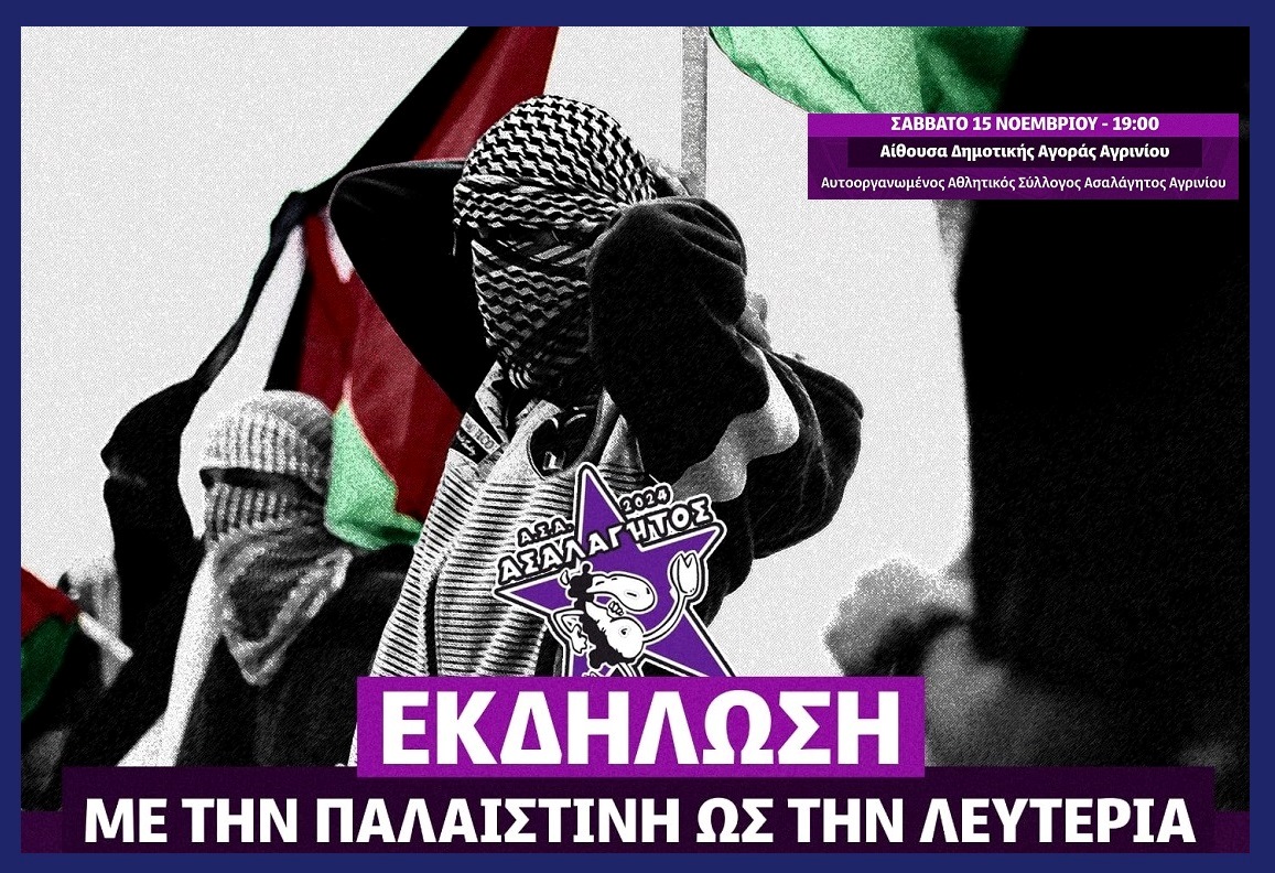 Ο αυτοοργανωμένος αθλητικός σύλλογος Ασαλάγητος Αγρινίου καλεί το Σάββατο 15 Νοεμβρίου στις 19:00 μ.μ. σε συζήτηση που θα πραγματοποιηθεί στην αίθουσα της παλαιάς Δημοτικής Αγοράς Αγρινίου με την συμμετοχή της Παλαιστινιακής Παροικίας Δυτικής Ελλάδος για αλληλεγγύη στον Παλαιστινιακό λαό.