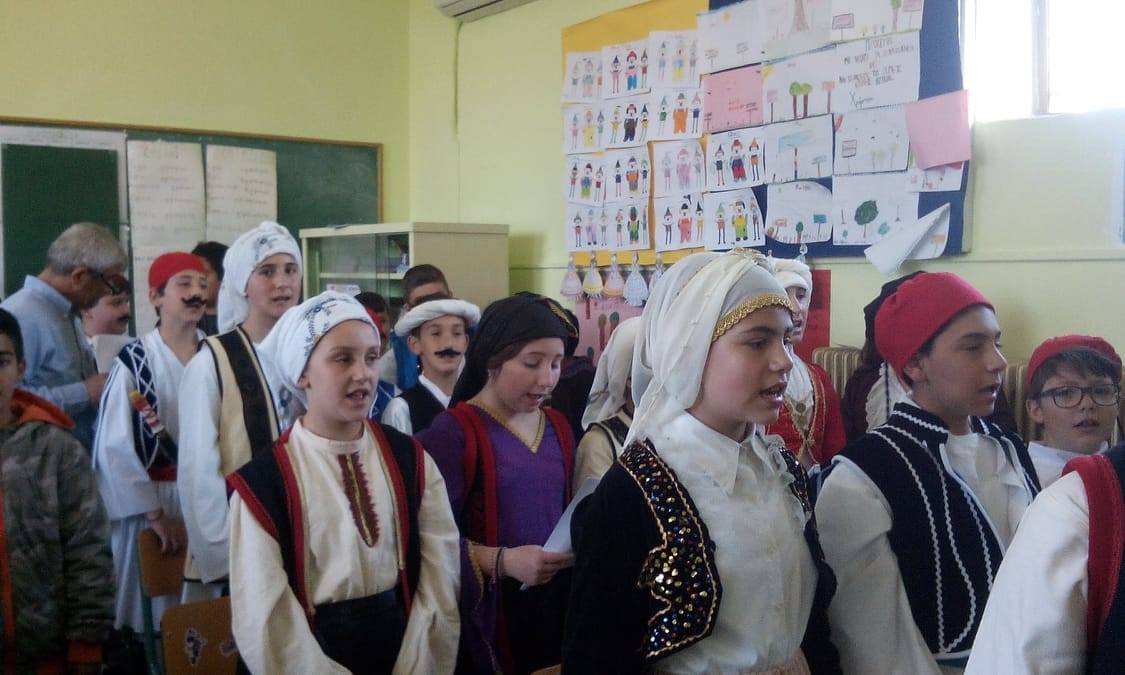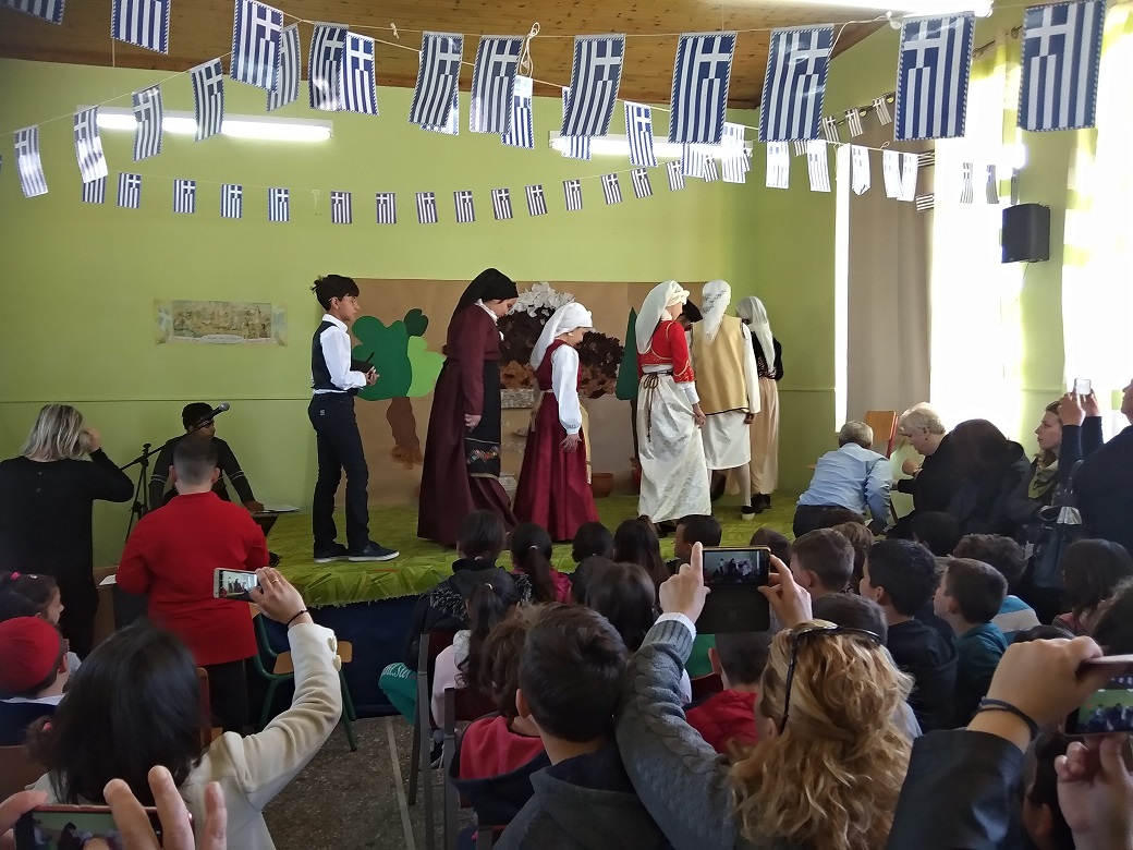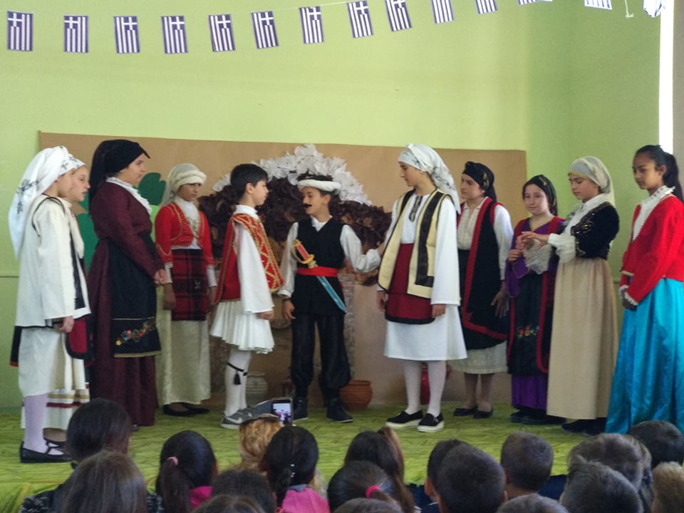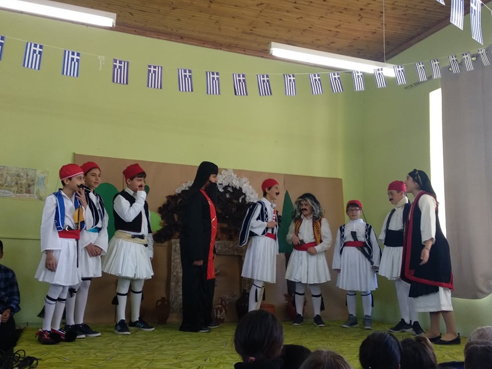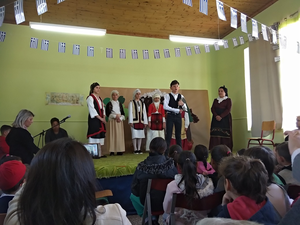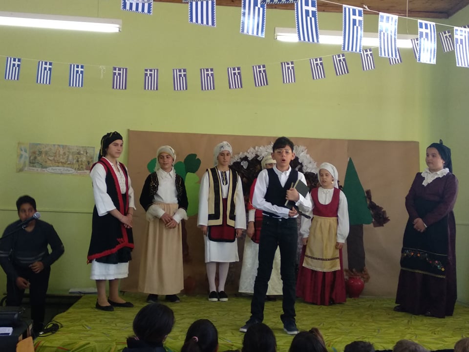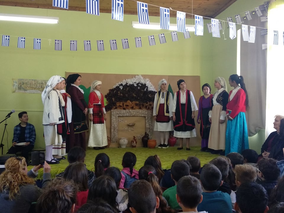 Στην αρχή της σχολικής γιορτής στο Δημοτικό Σχολείο, η χορωδία τραγούδησε το «Υπερμάχω» ενώ ακολούθως απαγγέλθηκαν ποιήματα από μαθητές και παραδοσιακά τραγούδια από την χορωδία του σχολείου.