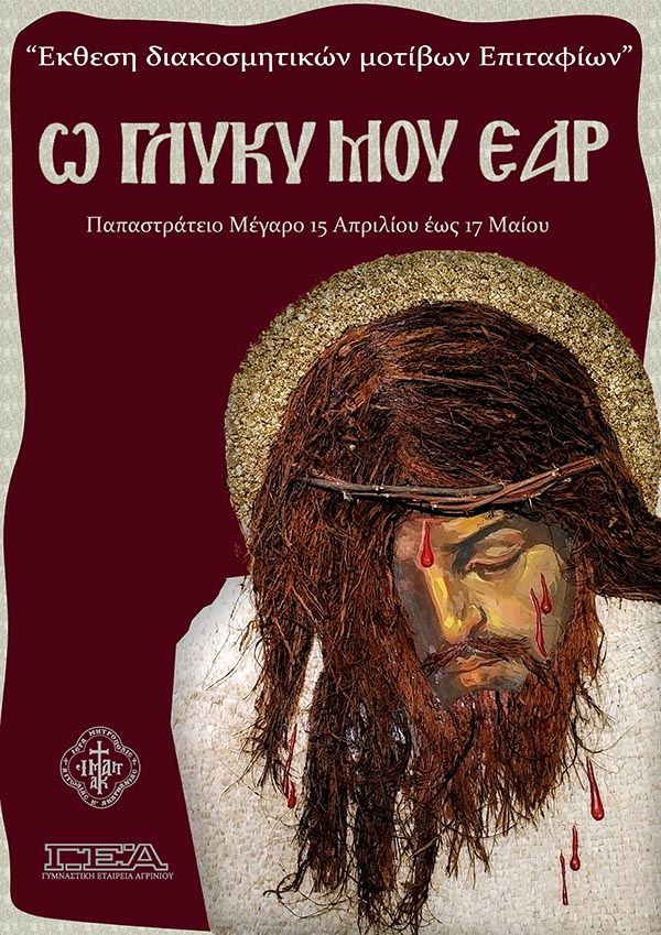 Η Ιερά Μητρόπολις Αιτωλίας & Ακαρνανίας και η Σχολή Τοπικής Ιστορίας & Πολιτισμού «Αθανάσιος Παλιούρας», που λειτουργεί στα πλαίσια του Τμήματος Πνευματικών και Καλλιτεχνικών Εκδηλώσεων της Γυμναστικής Εταιρείας Αγρινίου, συνδιοργανώνουν έκθεση με διακοσμητικά μοτίβα Ιερών Επιταφίων, που καλύπτουν μεγάλη χρονική περίοδο και συγκεντρώθηκαν από Ιερούς Ναούς του Δήμου Αγρινίου και ιδιωτικές συλλογές.