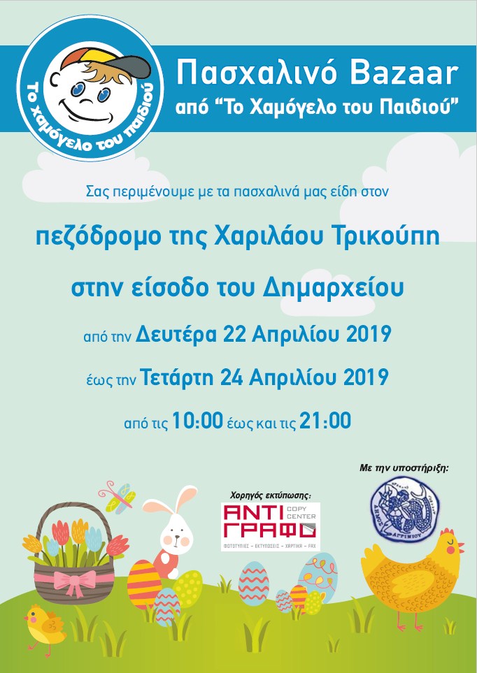 Πασχαλινή αγορά διοργανώνει «Το Χαμόγελο του Παιδιού» στο Αγρίνιο από τις 22 έως τις 24 Απριλίου 2019, στον Πεζόδρομο Χαρ. Τρικούπη (είσοδος Δημαρχείου) και σας περιμένει όλους να το επισκεφτείτε.