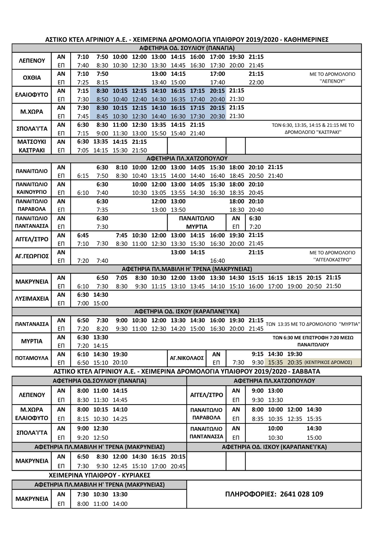 Ανακοινώθηκαν και τίθενται σε ισχύ από το Αστικό ΚΤΕΛ Αγρινίου τα χειμερινά δρομολόγια 2019-2020 και για την διαδρομή Πλάτανος - Καλύβια – Αγγελόκαστρο, τις καθημερινές και Σάββατα τα δρομολόγια θα εκτελούνται ως εξής: