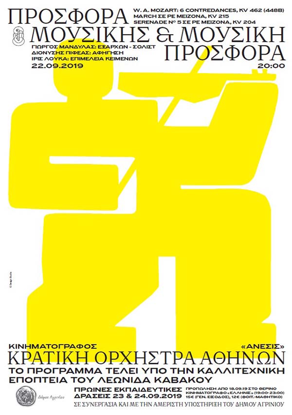 Μετά την συγκινητική, από πλευράς ανταπόκρισης, περυσινή συναυλίαη Κρατική Ορχήστρα Αθηνών θα εμφανιστεί την Κυριακή 22 Σεπτεμβρίου 2019 στο Δημοτικό Κινηματογράφο Αγρινίου «Άνεσις.