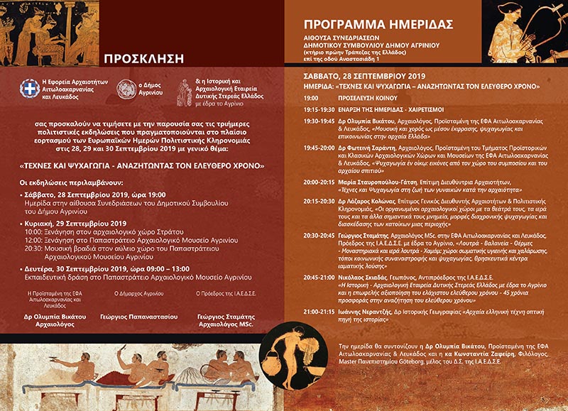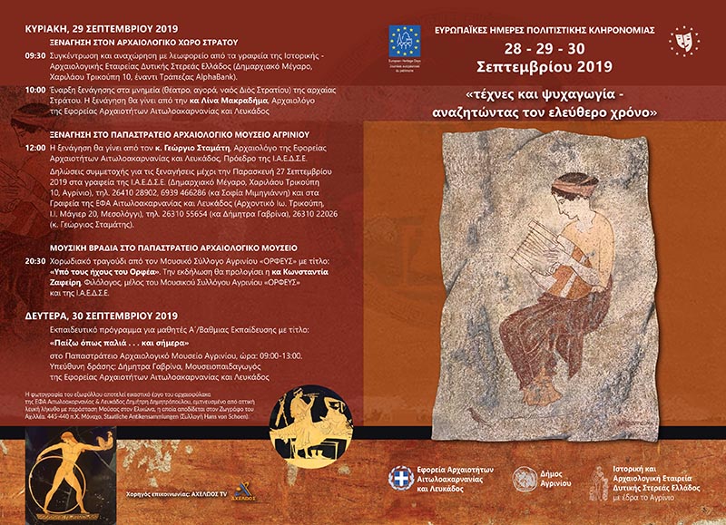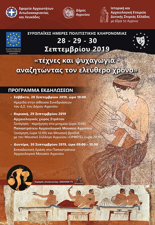 H Εφορεία Αρχαιοτήτων Αιτωλοακαρνανίας και Λευκάδος επί επτά συναπτά έτη γιορτάζει τις Ευρωπαϊκές Ημέρες Πολιτιστικής Κληρονομιάς που διοργανώνονται από τη Διεύθυνση Μουσείων, Αρχαιολογικών Χώρων, Εκθέσεων και Εκπαιδευτικών Προγραμμάτων του Υπουργείου Πολιτισμού και Αθλητισμού. Στο πλαίσιο του φετινού εορτασμού με γενικό θέμα «ΨΥΧΑΓΩΓΙΑ ΚΑΙ ΤΕΧΝΕΣ – ΑΝΑΖΗΤΩΝΤΑΣ ΤΟΝ ΕΛΕΥΘΕΡΟ ΧΡΟΝΟ», η ΕΦΑ Αιτωλοακαρνανίας & Λευκάδος σε συνεργασία με την Ιστορική & Αρχαιολογική Εταιρεία Δυτικής Στερεάς Ελλάδος με έδρα το Αγρίνιο και τον Δήμο Αγρινίου, διοργανώνει πολιτιστικές εκδηλώσεις από 28 έως 30 Σεπτεμβρίου και 4 Οκτωβρίου. Το αναλυτικό πρόγραμμα των εκδηλώσεων έχει ως εξής: