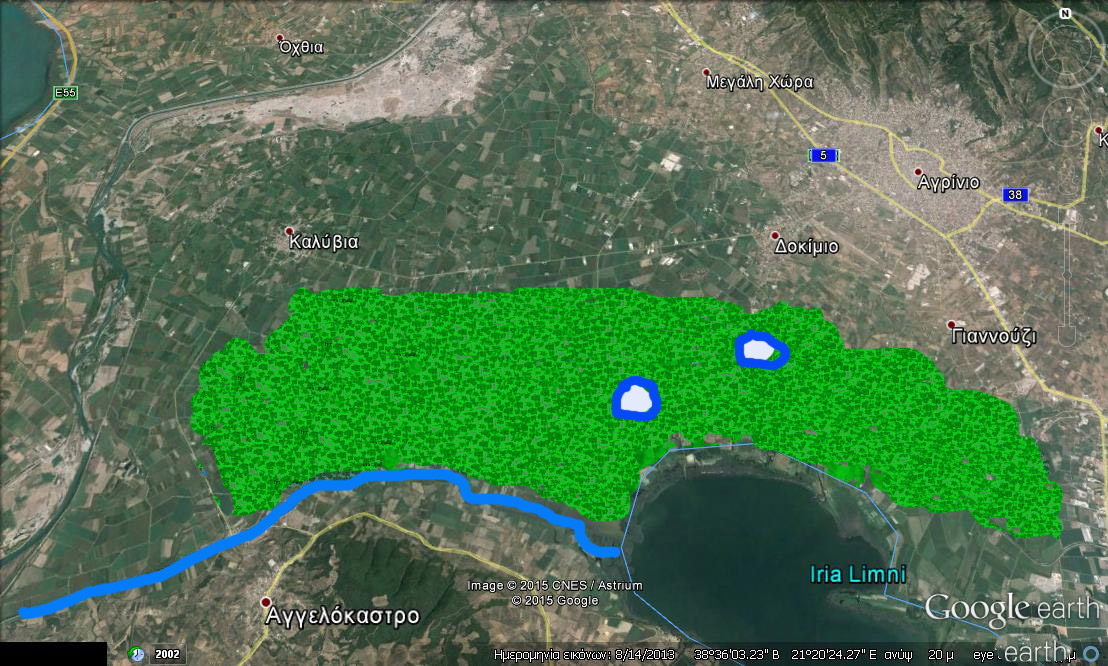 Προσπάθεια απεικόνισης (με επιφύλαξη) με πράσινο χρώμα του Δάσους της Λυσιμαχίας που δέσποζε στην Αιτωλική Πεδιάδα και εξαφανίστηκε τη δεκαετία του 1940. Έφτανε ως τον σημερινό περίπου δρόμου Δοκιμίου-Καλυβίων και κάλυπτε όλη τη σημερινή έκταση του στρατιωτικού αεροδρομίου.