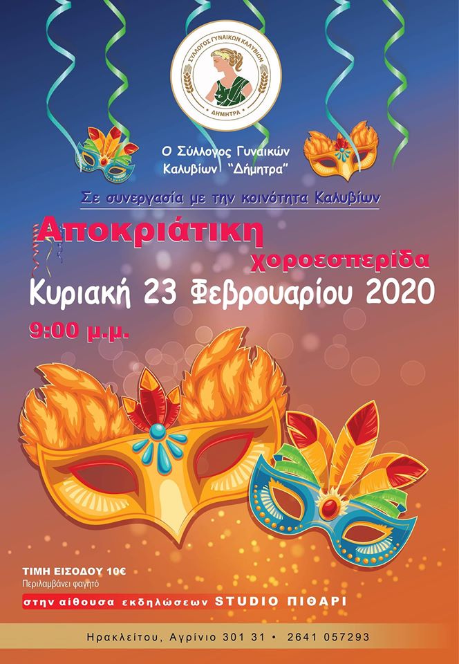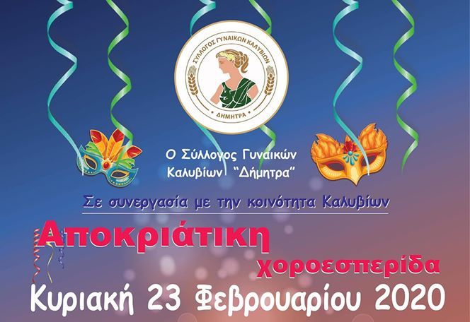 Ο Σύλλογος Γυναικών Καλυβίων «Δήμητρα» σε συνεργασία με την Κοινότητα Καλυβίων, διοργανώνουν Αποκριάτικη Χοροεσπερίδα, την Κυριακή 23 Φεβρουαρίου 2020, στις 9 το βράδυ, στην αίθουσα εκδηλώσεων Studio Πιθάρι στο Γιαννούζι Αγρίνιου (οδός Ηρακλείτου).