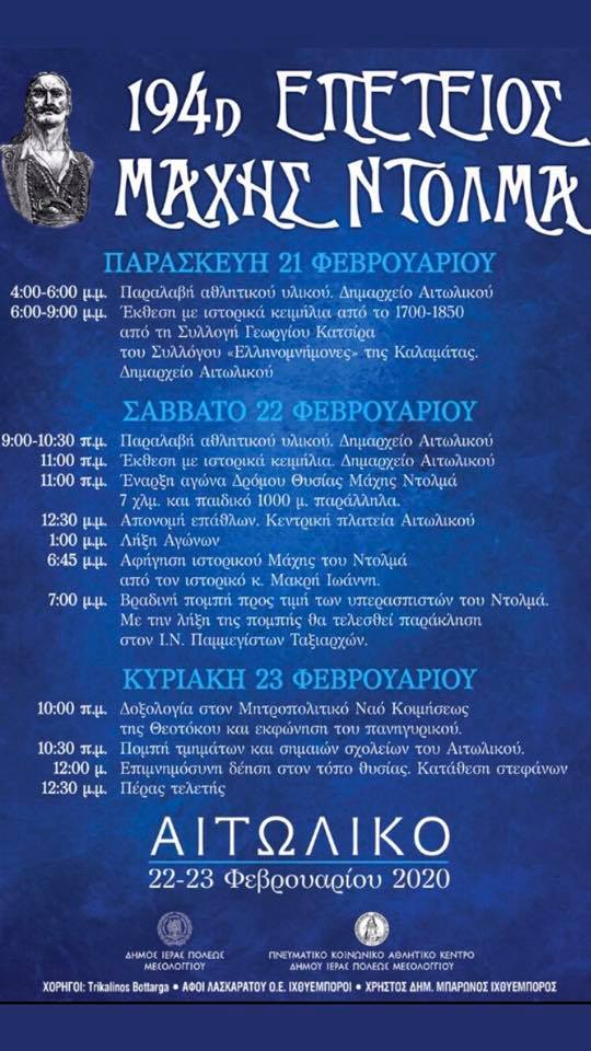 10.30 π.μ. Πομπή προς τιμή των Υπερασπιστών του Ντολμά τμημάτων και σημαιών σχολείων του Αιτωλικού.