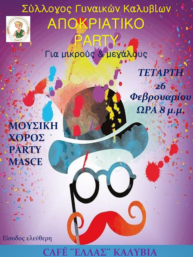 Ο Σύλλογος Γυναικών Καλυβίων «Δήμητρα» σας προσκαλεί στο αποκριάτικο μασκέ party που θα πραγματοποιηθεί στο Café ΕΛΛΑΣ, την Τετάρτη 26 Φεβρουαρίου, στις 8 το βράδυ!