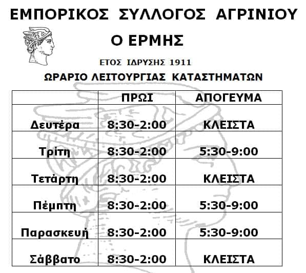 Μετά την απόφαση της κυβέρνησης για την τμηματική και σταδιακή επαναλειτουργία της αγοράς, ο Εμπορικός Σύλλογος Αγρινίου ανακοινώνει το ΠΡΟΣΩΡΙΝΟ ωράριο λειτουργίας των καταστημάτων.