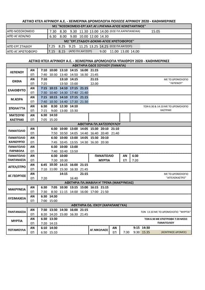 Ειδικά για την γραμμή Αγρίνιο- Πλάτανος-Καλύβια-Αγ. Γεώργιος -Αγγελόκαστρο τα δρομολόγια θα πραγματοποιούνται τις κάτωθι ώρες: