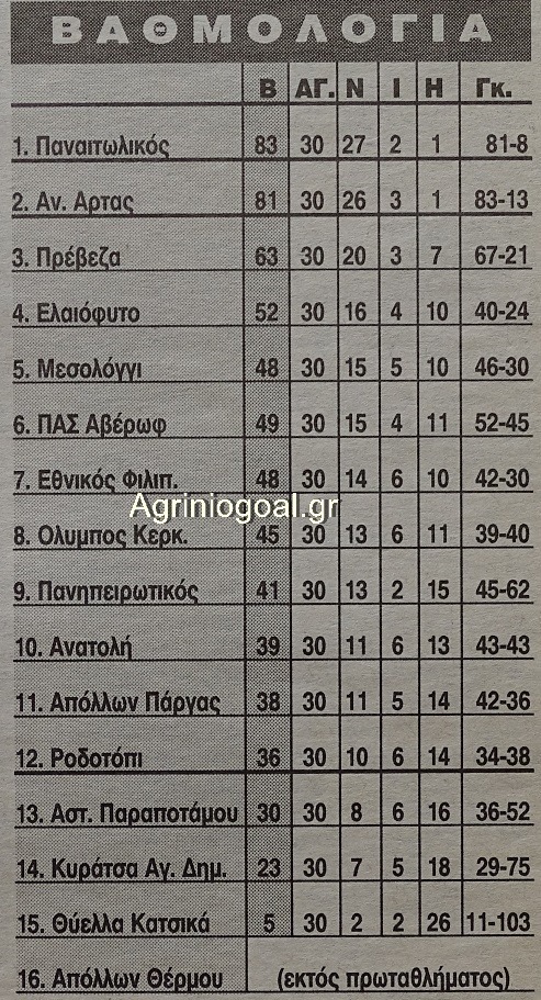 Ο Παναιτωλικός δεν είχε κανένα απολύτως πρόβλημα να πάρει τη νίκη απέναντι στην Ανατολή και κατάκτησε την πρώτη θέση του ομίλου. Δεύτερη η Αναγέννηση Άρτας, η οποία πλήρωσε το «στραβοπάτημα» της περασμένης αγωνιστικής' με το Ροδοτόπι και τώρα θα διεκδικήσει την άνοδο στα μπαράζ. Παρελθόν από το Περιφερειακό Πρωτάθλημα αποτελούν ο Αστέρας Παραποτάμου, η Κυράτσα Αγίου Δημητρίου, η Θύελλα Κατσικά και ο Απόλλωνας Θέρμου.