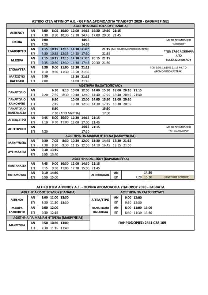 Ειδικά για την γραμμή Αγρίνιο- Πλάτανος-Καλύβια-Αγ. Γεώργιος –Αγγελόκαστρο, τα δρομολόγια κατά τη θερινή περίοδο θα πραγματοποιούνται τις κάτωθι ώρες: