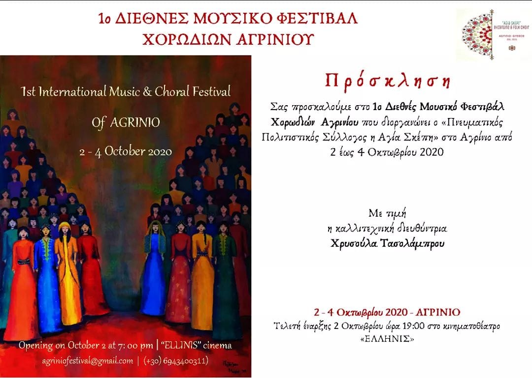 Ο «Πνευματικός Πολιτιστικός Σύλλογος Αγία Σκέπη» με κύρια δραστηριότητα τη χορωδία «Αγία Σκέπη», επίσημος εγγεγραμμένος φορέας του Υπουργείου Πολιτισμού (αρ.μητρ. 6113) ανακοινώνει το «1ο Διεθνές Φεστιβάλ Χορωδιών Αγρινίου 2020» - 1st International Choral Festival of Agrinio 2020» που θα διεξαχθεί στο Αγρίνιο στις 2, 3 και 4 Οκτωβρίου 2020.