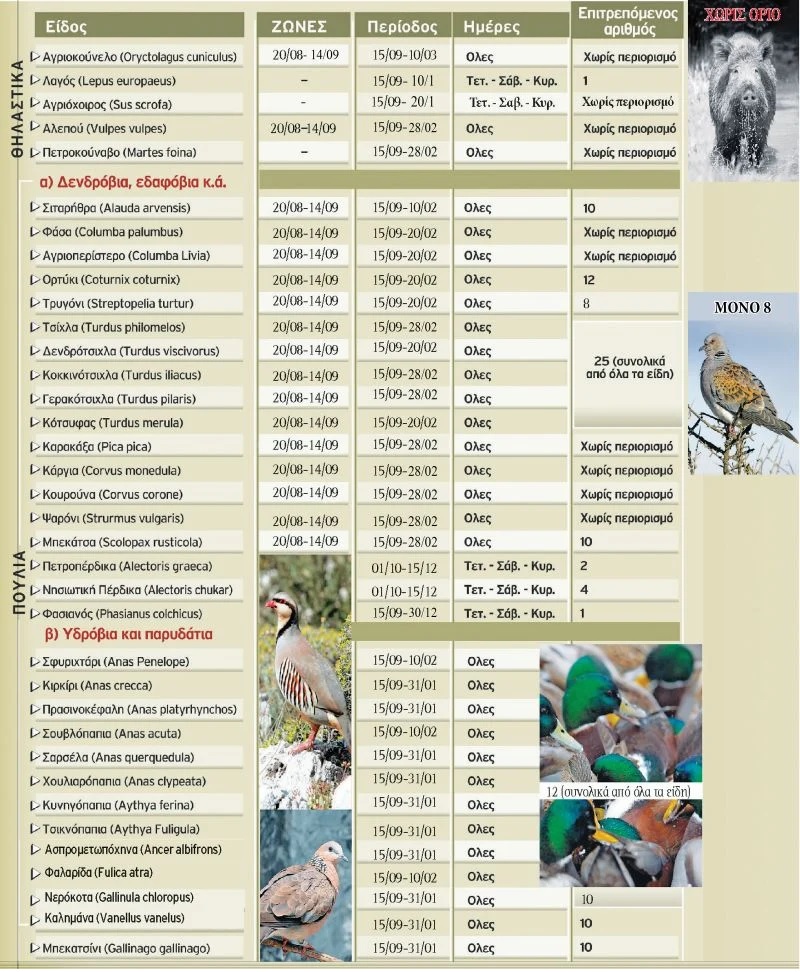 Σε ότι αφορά τα θηράματα, η μόνη αλλαγή που έγινε σε σχέση με την περσινή περίοδο είναι η μείωση των κυνηγετικών εξορμήσεων της πέρδικας κατά μια ημέρα την εβδομάδα στη Χίο. Δηλαδή, αντί για Τετάρτη – Σάββατο – Κυριακή, το κυνήγι της πέρδικας θα επιτρέπεται μόνο Σάββατο και Κυριακή.