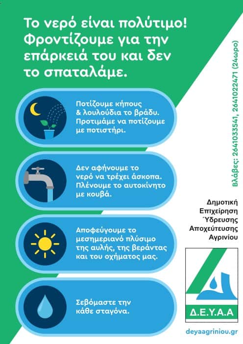 Η ΔΕΥΑ Αγρινίου, με ανακοίνωση που κοινοποίησε, υπενθυμίζει στους δημότες και καταναλωτές ότι, η ορθολογική διαχείριση των υδάτινων πόρων και η εξοικονόμηση νερού, ιδιαίτερα τους καλοκαιρινούς μήνες, είναι επιβεβλημένη.