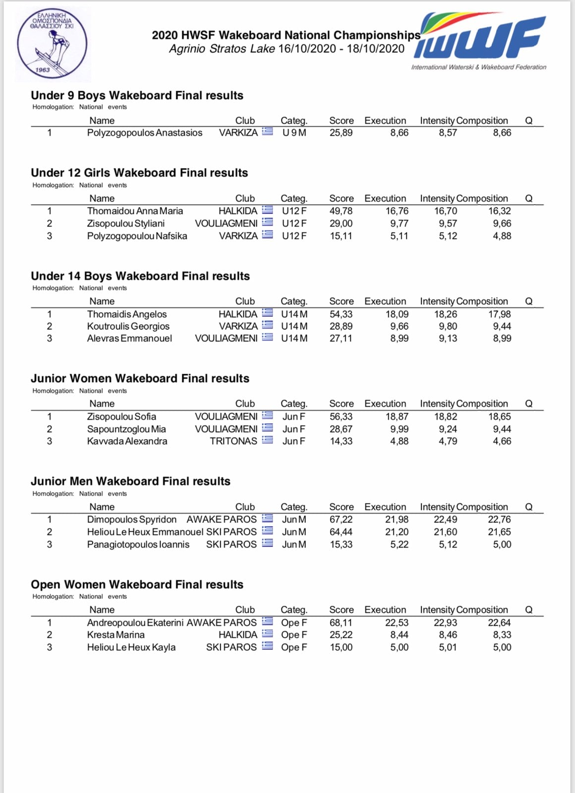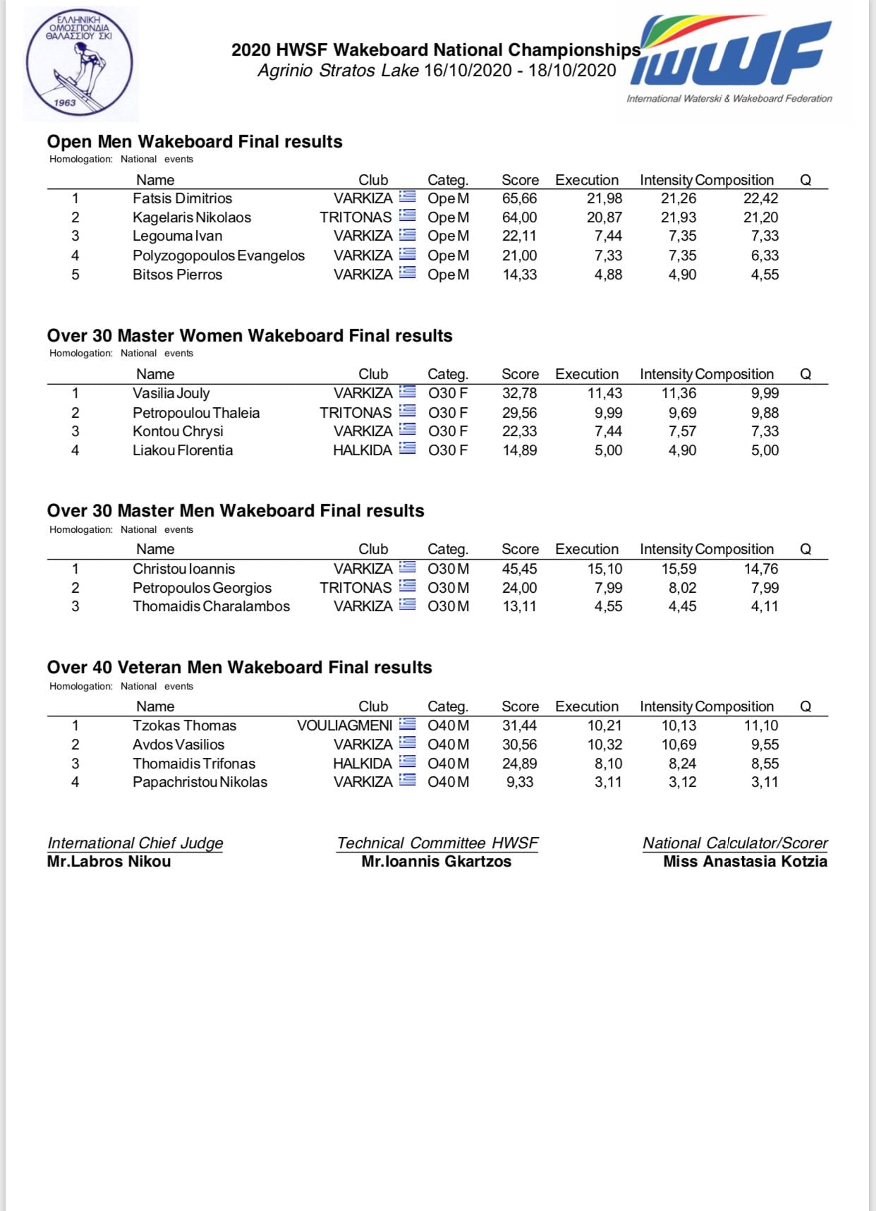 Με επιτυχία ολοκληρώθηκε στο Εθνικό Προπονητικό Κέντρο Waterski / Wakeboard στην Λίμνη Στράτου, κοντά στο Αγρίνιο, το Πανελλήνιο Πρωτάθλημα Wakeboard όλων των κατηγοριών, που διοργανώθηκε από την Ελληνική Ομοσπονδία Θαλασσίου Σκι το διήμερο 17 &18 Οκτωβρίου 2020.