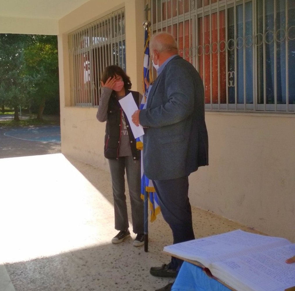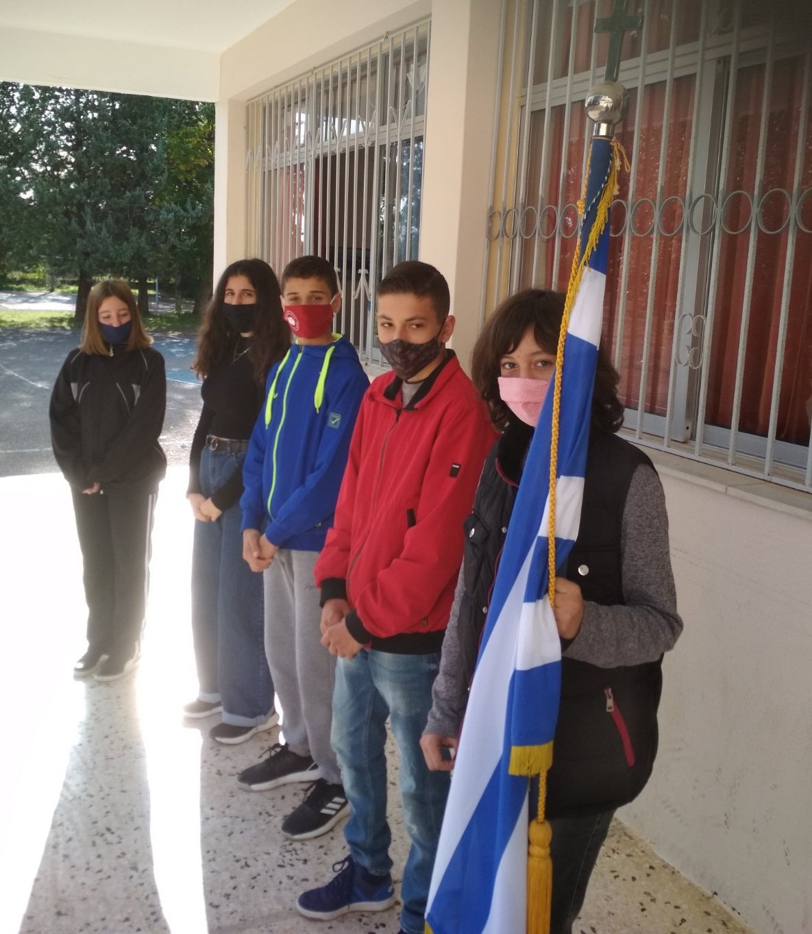 Επίσης αμέσως μετά, ο Διευθυντής του Γυμνασίου παρέδωσε τη σημαία στον σημαιοφόρο και ορίστηκαν οι παραστάτες που θα τον πλαισιώνουν.