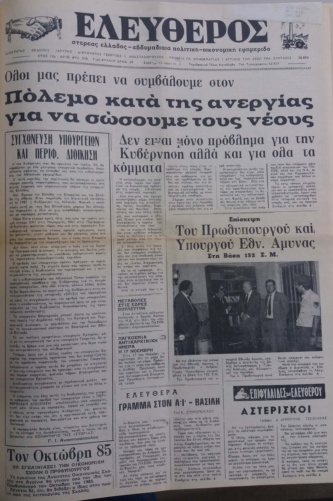 - Αρχείο Εφημερίδας «Ελεύθερος», Σάββατο 15 Ιουνίου 1985 (αρ. φύλλου 508) - Αρχείο Παπαστρατείου Δημοτικής Βιβλιοθήκης.