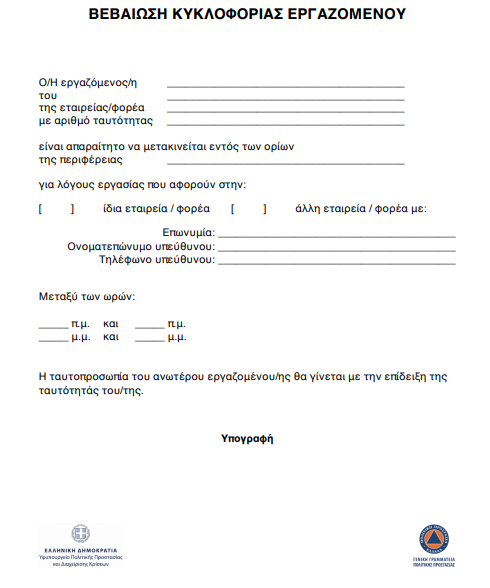 Σε αυτό το καθεστώς απαγόρευσης της κυκλοφορίας, οι μετακινήσεις των πολιτών και εν προκειμένω των αγροτών και κτηνοτρόφων καθώς και των αγρεργατών προς και από τις εκμεταλλεύσεις, εξυπηρετούνται με μια πάγια βεβαίωση κίνησης τύπου Α και παρέχεται, με προσωπική ευθύνη του υπογράφοντος, από τον εργοδότη ή, σε περίπτωση νομικού προσώπου από τον νόμιμο εκπρόσωπό του ή, σε περίπτωση ελεύθερου επαγγελματία ή αυτοαπασχολούμενου, από τον ίδιο.