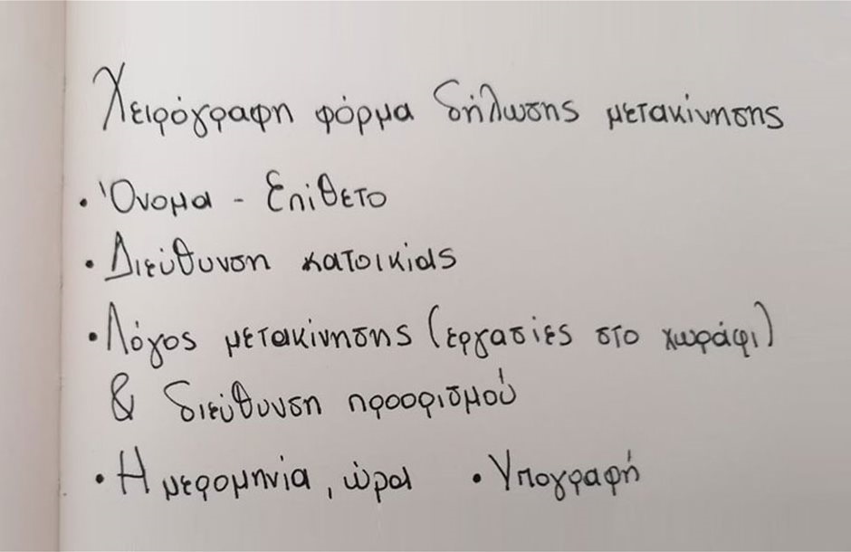 Σε διαφορετική περίπτωση και εφόσον οι συνθήκες δεν διευκολύνουν την ηλεκτρονική συμπλήρωση του εγγράφου, προβλέπεται η διευκόλυνση των ενδιαφερομένων μέσω της συμπλήρωσης ειδικής χειρόγραφης δήλωσης κατά τα πρότυπα της άνοιξης, όπου αναγράφεται ευκρινώς το Ονοματεπώνυμο, ο τόπος της μόνιμης κατοικίας, ο προορισμός (κτήματα, κτηνοτροφική μονάδα), ο σκοπός και η διάρκεια της μετακίνησης (π.χ. εργασίες στο χωράφι από…έως), ώρα, ημερομηνία και υπογραφή.