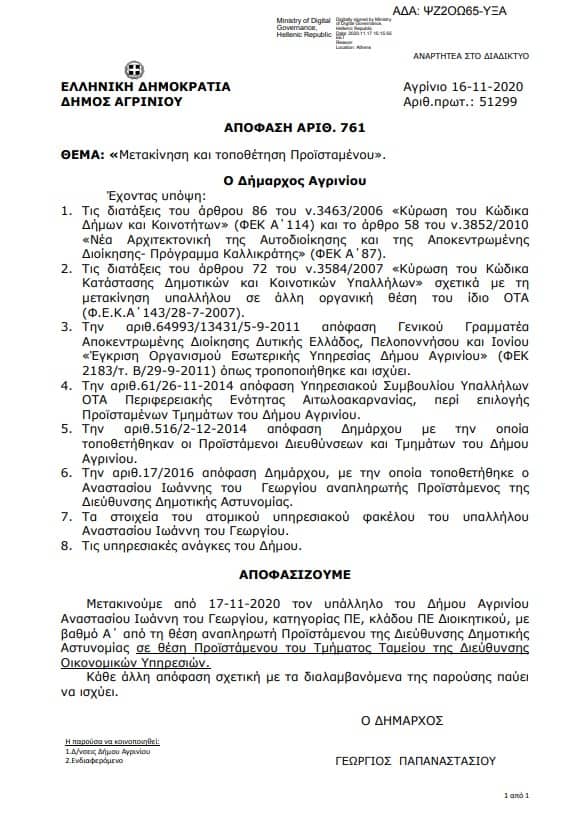 Με απόφαση του δημάρχου Αγρινίου Γιώργου Παπαναστασίου, που κοινοποιήθηκε σήμερα (Διαύγεια), νέος Προϊστάμενος του Τμήματος Ταμείου της Διεύθυνσης Οικονομικών Υπηρεσιών, του δήμου Αγρινίου, θα είναι ο συγχωριανός μας, Ιωάννης Γ. Αναστασίου.
