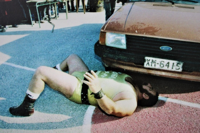 Είχα σπάσει ένα αυτοκίνητο στην εκπομπή: «Κάθε μέρα παντού» με τον Ντέμη Αντύπα. Είχα σπάσει ένα αυτοκίνητο. Τότε παρουσιάζονταν για πρώτη φορά τα μονά-ζυγά και το νόημα ήταν πως οδηγώ το αυτοκίνητο και αφού οδηγώ υποτίθεται χαλάει, κατεβαίνω κάτω και λέω: «Μια μονά-ζυγά, μια χαλάει το αυτοκίνητο, τι να το κάνω;» και αρχίζω και τρελαίνομαι, βγάζω τις πόρτες, σπάω το καπό επάνω, μέχρι που στο τέλος το κάνω μια τούμπα και το αναποδογυρίζω και δείχνει ο φακός πως πάω με ένα τιμόνι που το είχα ξεκολλήσει. Από εκεί ξεκίνησα, όπως και το 1980 στα «Απίστευτα και όμως Αληθινά» είχα τραβήξει 4 βαγόνια τρένα, είχε γίνει αρκετά γνωστό σε όλον το κόσμο και μετά ξεκίνησαν άλλα, όπως την νταλίκα 35 τόνων στην Αραβία. Είχα πάει για παλαιστικούς αγώνες και συγκεκριμένα στο Κουβέιτ, όπου παραλίγο να εγκλωβιστώ εκεί στον πόλεμο. Είχα πάει εγώ, ο Καρυστινός ο Παλαιστής και ο Παπαλαζάρου ο Κώστας και το γήπεδο ήταν γεμάτο, αλλά ξεκινούσε φασαρία, πόλεμος Ιράκ-Κουβέιτ. Εν πάση περιπτώσει τράβηξα μια νταλίκα 35 τόνων, όπως και εδώ πολλά άλλα.