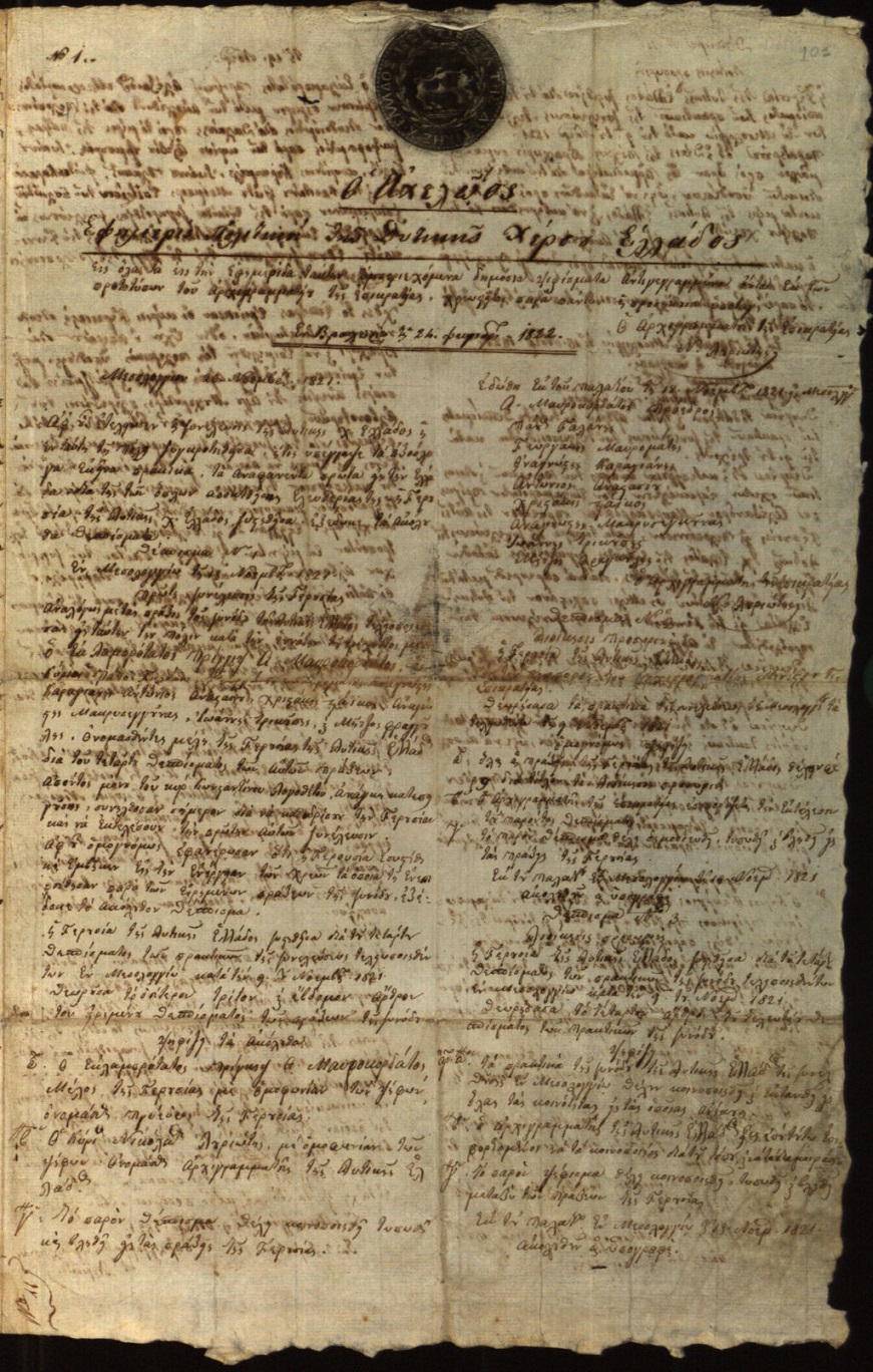 Τον περασμένο Αύγουστο, η «Πρωτοβουλία 1821-2021» παρουσίασε στο έκθεμα του μήνα ένα μοναδικό τεκμήριο, το φύλλο της 24ης Φεβρουαρίου 1822 της χειρόγραφης εφημερίδας «Ο Αχελώος» από το «Αρχείο A. Λουριώτη» που βρίσκεται στο Ινστιτούτο Ιστορικών Ερευνών- Εθνικό Iδρυμα Ερευνών.