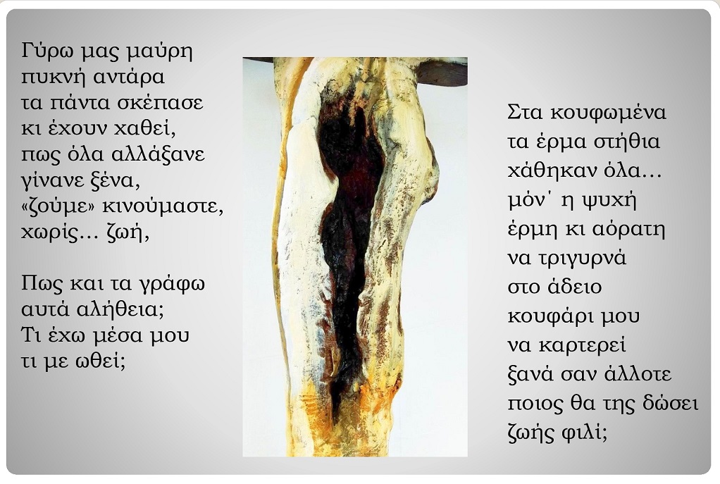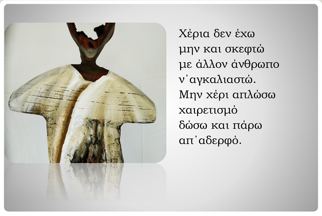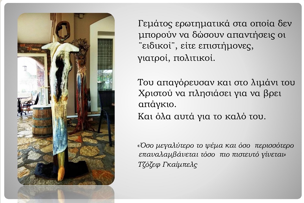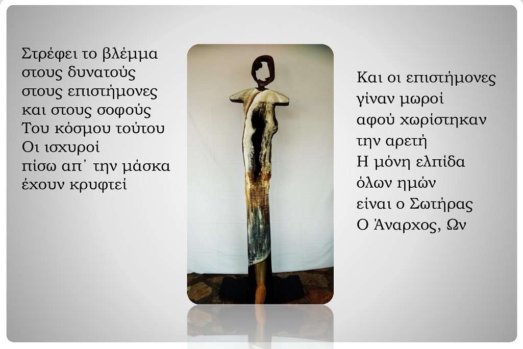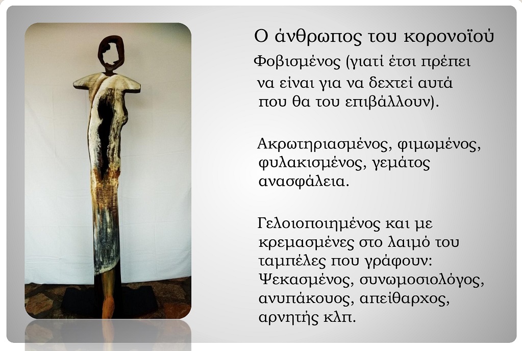 Η πανδημία του κορονοϊού που ενέσκυψε τους τελευταίους μήνες στην πατρίδα μας και σε όλο τον κόσμο, επηρρέασαν και ενέπνευσαν τον συγχωριανό μας Δημήτρη Μαλεσιάδα, από τον Άγιο Γεώργιο Καλυβίων, ώστε να δημιουργήσει ένα ξύλινο γλυπτό και να συνθέσει ένα ποίημα όπου περιγράφει τις εσωτερικές του ανησυχίες και προβληματισμούς…