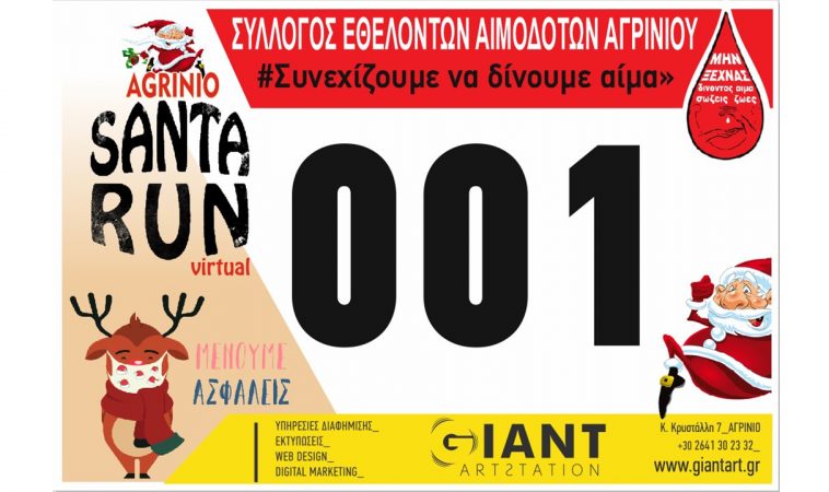 Ο φετινός αγώνας δρόμου «Αγρίνιο Santa Run Virtual», λόγω της πανδημίας του κορωνοϊού, έγινε… εικονικά (virtual) και ο καθένας από τους συμμετέχοντες μπορούσε να τρέξει σε κάποια από τη διαδρομή που προτείνονταν από τους διοργανωτές, συνεισφέροντας παράλληλα σε έναν κοινωνικό σκοπό!