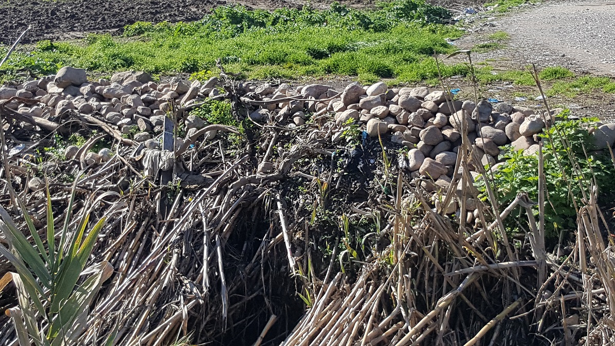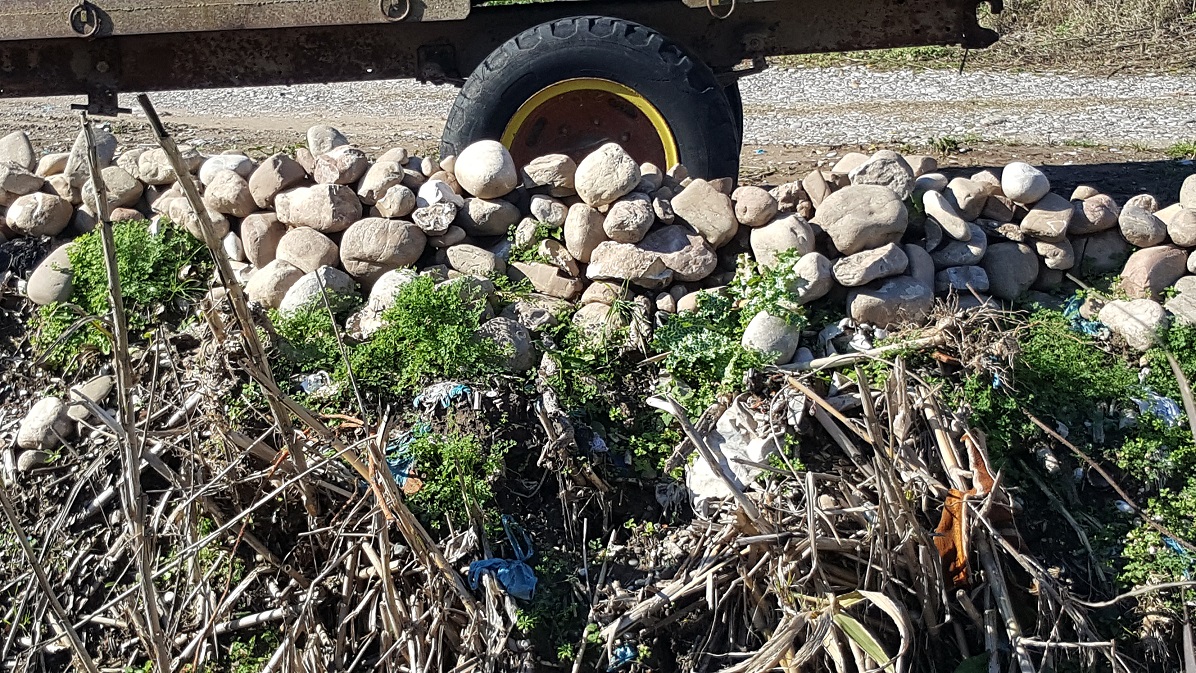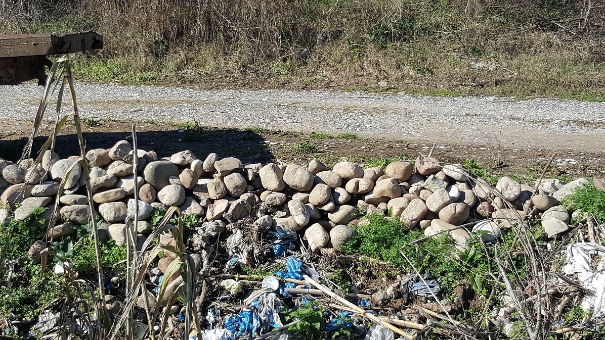 Οι παλιές πέτρες ή στρουμπουλίθια όπως τις έλεγαν οι γεροντότεροι, ¨λίαζονται¨ στην άκρη του χωμάτινου αύλακα και θυμίζουν ότι κάποτε αποτελούσαν κομμάτια των σπιτιών του παλιού χωριού των Καλυβίων, λίγα μέτρα από τον κοιμητηριακό ναό του Αγίου Νικολάου.