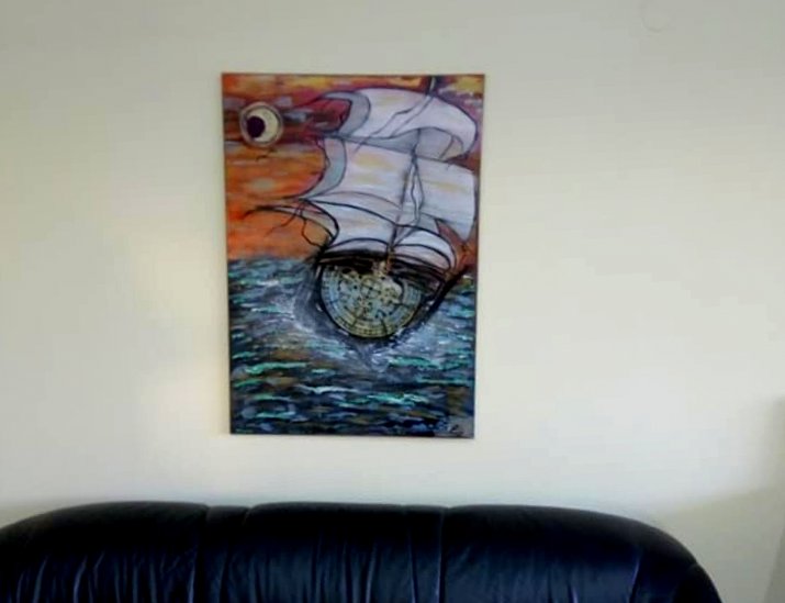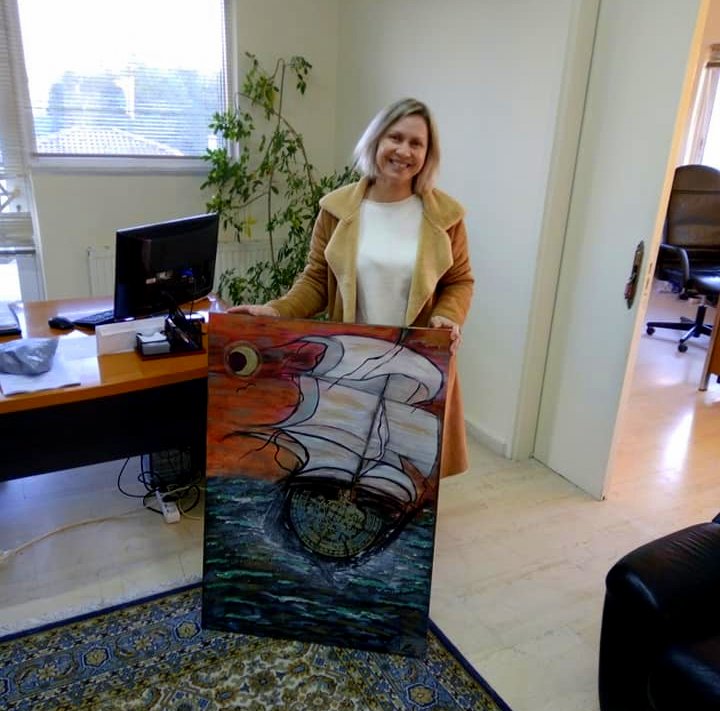 Έναν όμορφο ζωγραφικό πίνακα που αναπαριστά ένα ιστιοφόρο στη φουρτουνιασμένη θάλασσα, παρέδωσε χθες στον Προέδρο της Κοινότητας Καλυβίων, η συμπολίτισά μας Χρυσούλα Φούκα-Ζαπαντιώτη, η οποία είναι αυτοδίδακτη ζωγράφος.