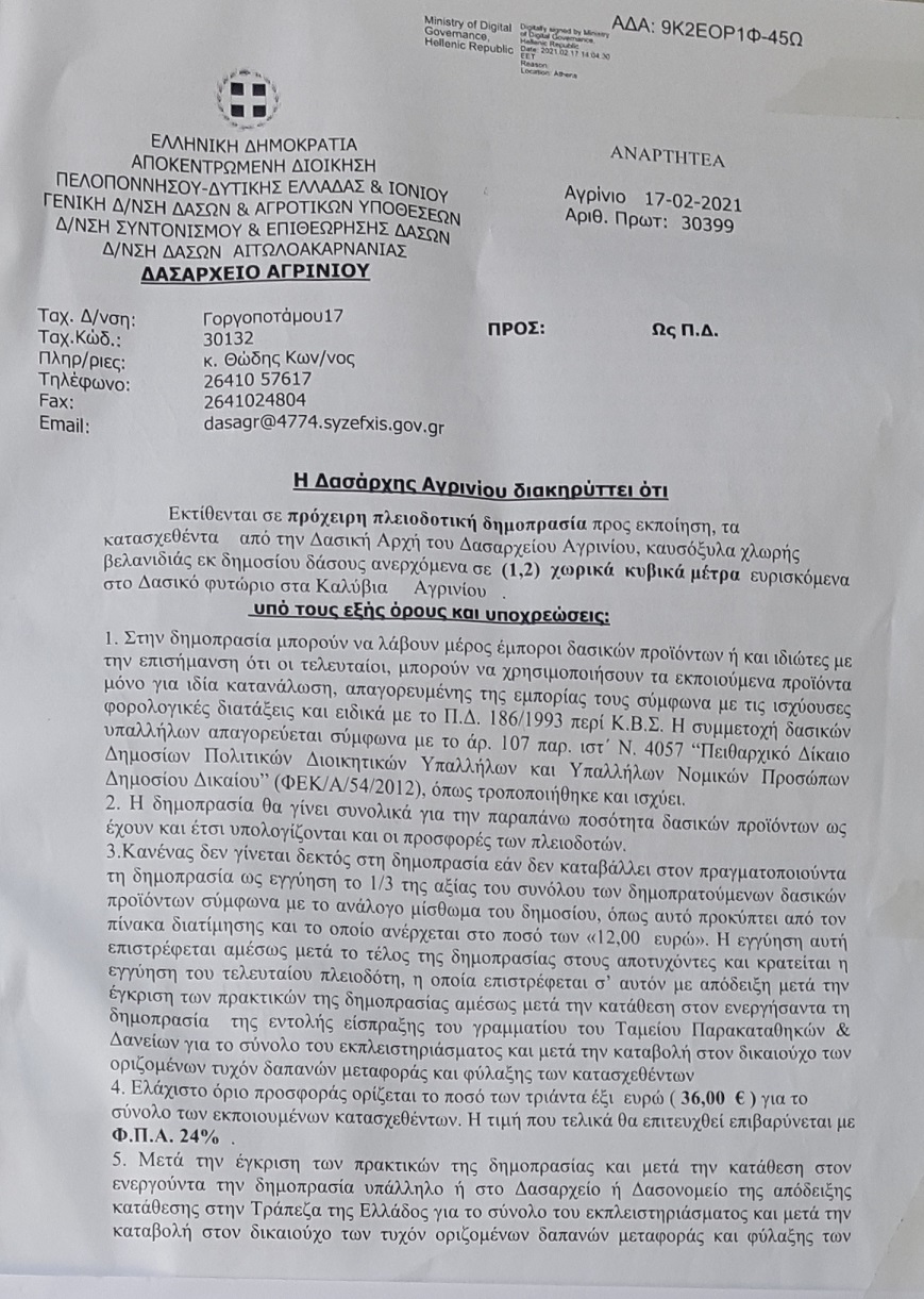 Η Δασάρχης Αγρινίου διακηρύττει ότι εκτί0ενται σε πρόχειρη πλειοδοτική δημοπρασία προς εκποίηση, τα κατασχεθέντα από την Δασική Αρχή του Δασαρχείου Αγρινίου, καυσόξυλα χλωρής βελανιδιάς εκ δηµοσίου δάσους, ανερχόμενοι σε (13) χωρικά κυβικά µέτρα ευρισκόµενα στο Δασικό Φυτώριο στα Καλύβια Αγρινίου.