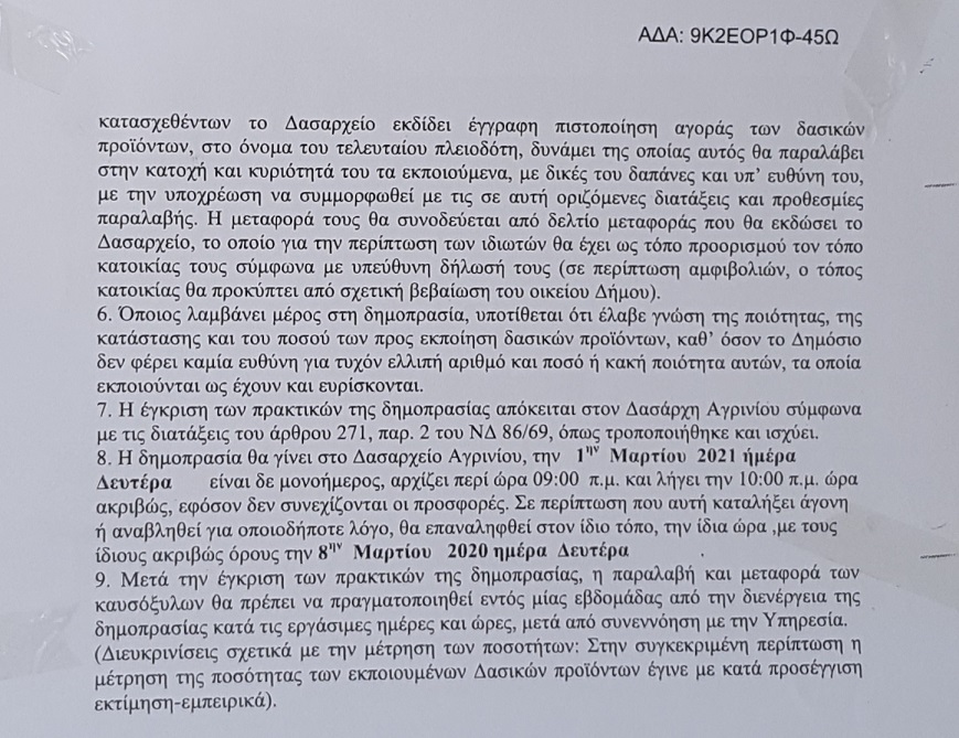 Σύμφωνα με την διακήρυξη, η δηµοπρασία θα γίνει στο Δασαρχείο Αγρινίου, την 1η Μαρτίου 2021 ηµέρα Δευτέρα είναι δε μονοήμερος, αρχίζει περί ώρα 09:00 π.µ. και λήγει την 10:00 π.µ. ώρα ακριβώς, εφόσον δεν συνεχίζονται οι προσφορές.