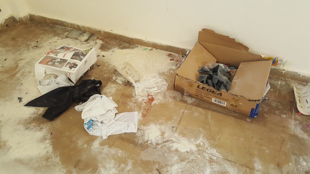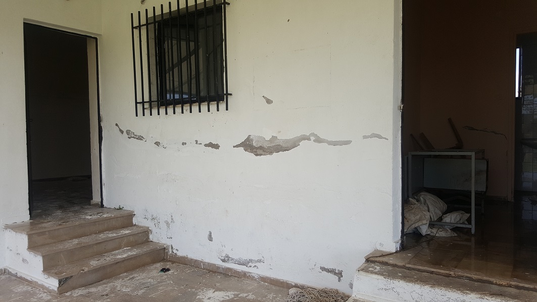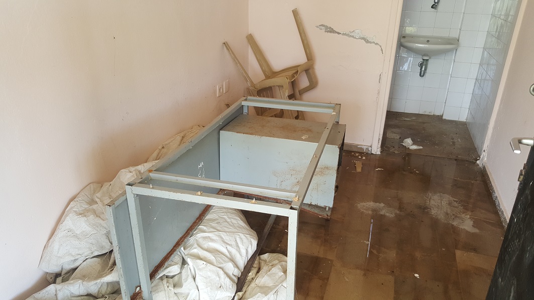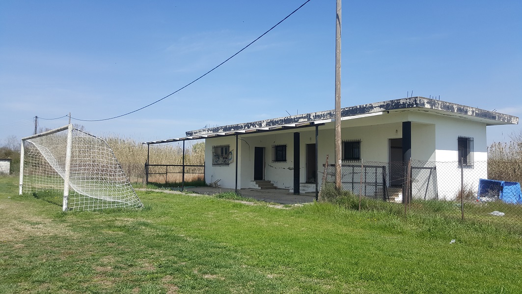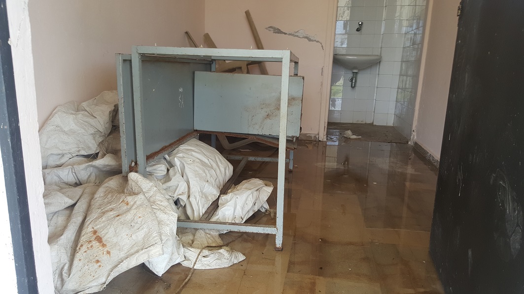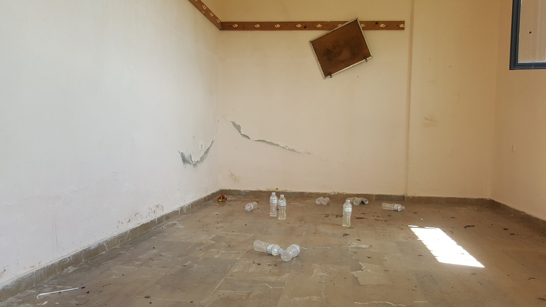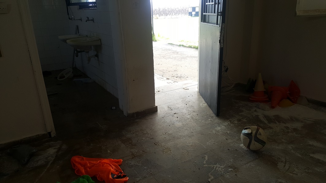 Οι πόρτες στα αποδυτήρια είναι ανοικτές και παραβιασμένες, στους εσωτερικούς χώρους έχει διασκορπιστεί γύψος που χρησιμοποιούνταν για τη διαγράμμιση του γηπέδου, στα δωμάτια των ομάδων και των διαιτητών υπάρχουν πεταμένα αντικείμενα και αθλητικό υλικό, λείπει ο ξύλινος πίνακας ανάλυσης τακτικής ενώ είναι πλημμυρισμένα από τη διαρροή νερού που προέρχεται από τις βρύσες και εξωτερικά υπάρχει αναποδογυρισμένος κάδος με πλαστικά μπουκάλια.