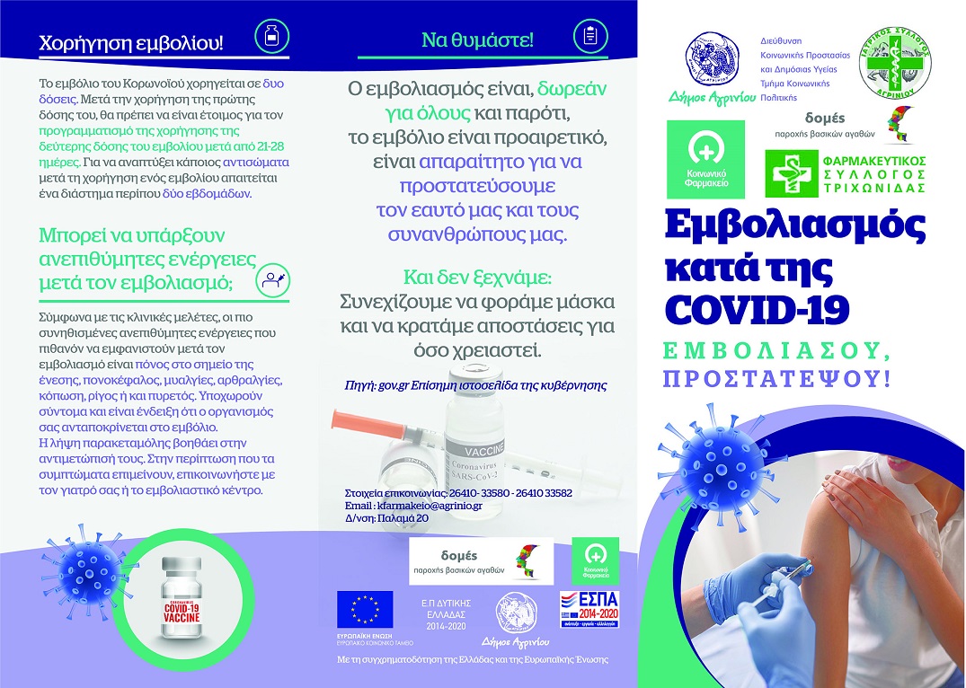 Ο Δήμος Αγρινίου (Διεύθυνση Κοινωνικής Προστασίας & Δημόσιας Υγείας- Κοινωνικό Φαρμακείο- Δομές Παροχής Βασικών Αγαθών), ο Ιατρικός Σύλλογος Αγρινίου και ο Φαρμακευτικός Σύλλογος Τριχωνίδος ενημερώνουν για την εθνική εκστρατεία εμβολιασμού.