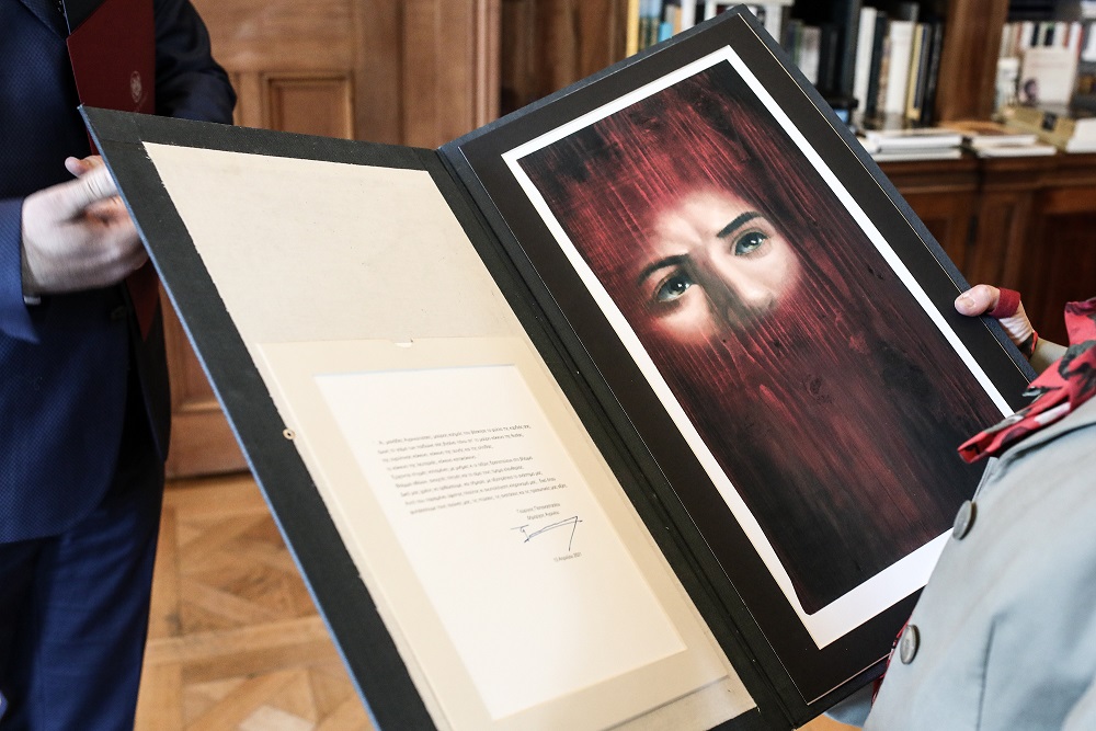 Τέλος, ο Δήμαρχος Αγρινίου πρόσφερε στην κ. Σακελλαροπούλου αντίγραφο του έργου "Πορφυρό βλέμμα" του Χρήστου Γαρουφαλή, από την μεγάλη ενότητα έργων του ζωγράφου "Ανθρώπων βλέμματα", υπογεγραμμένο από τον καλλιτέχνη.