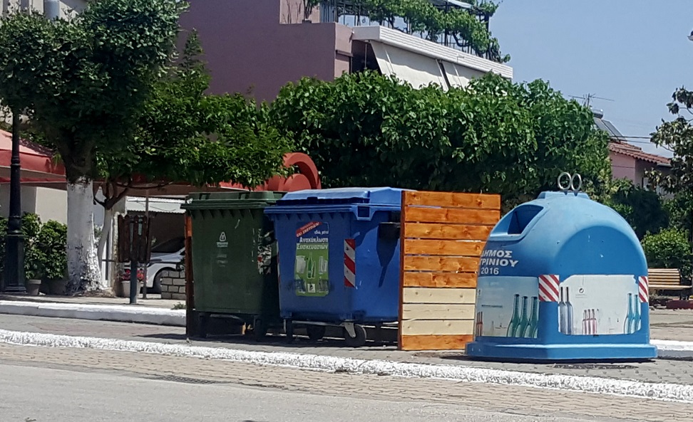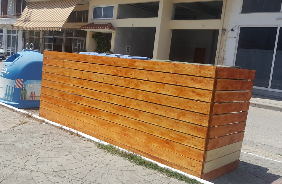 Μια όμορφη παρέμβαση αποτελεί και η κατασκευή που τοποθετήθηκε στους κάδους επί της πλατείας από ιδιώτη καταστηματάρχη, ο οποίος πήρε την όμορφη πρωτοβουλία.