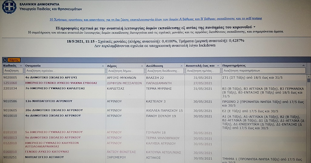 Να σημειώσουμε ότι, ο πίνακας αναστολών λειτουργίας δομών εκπαίδευσης διενεργείται από τις σχολικές μονάδες και τις αρμόδιες διευθύνσεις εκπαίδευσης, ενώ την Τρίτη (18/05) ενημερώθηκε η σχετική διαδικτυακή λίστα στην ιστοσελίδα του Υπουργείου Παιδείας.