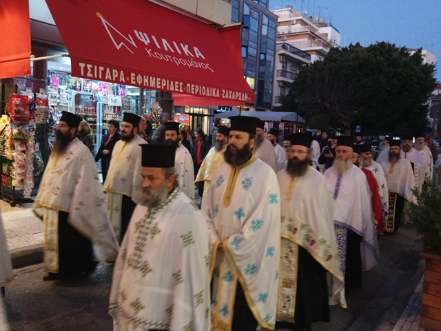 Αφού αποδόθηκαν με λαμπρότητα τιμές στην κεντρική πλατεία η Τιμία Ζώνη μεταφέρθηκε με λιτανευτική πομπή στον Μητροπολιτικό Ναό Ζωοδόχου Πηγής με τις τυμπανοκρουσίες να δονούν την ατμόσφαιρα και την Φιλαρμονική να παιανίζει.
