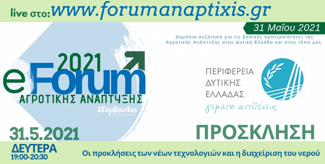 Η εφημερίδα «Σύμβουλος Επιχειρήσεων» σε συνεργασία με την Περιφέρεια Δυτικής Ελλάδας συνδιοργανώνουν στο πλαίσιο του e-Forum Αγροτικής Ανάπτυξης 2021, διαδικτυακή δημόσια συζήτηση με θέμα «Οι προκλήσεις των νέων τεχνολογιών και η διαχείριση του νερού» αύριο Δευτέρα, 31 Μαΐου και ώρα 19:00.